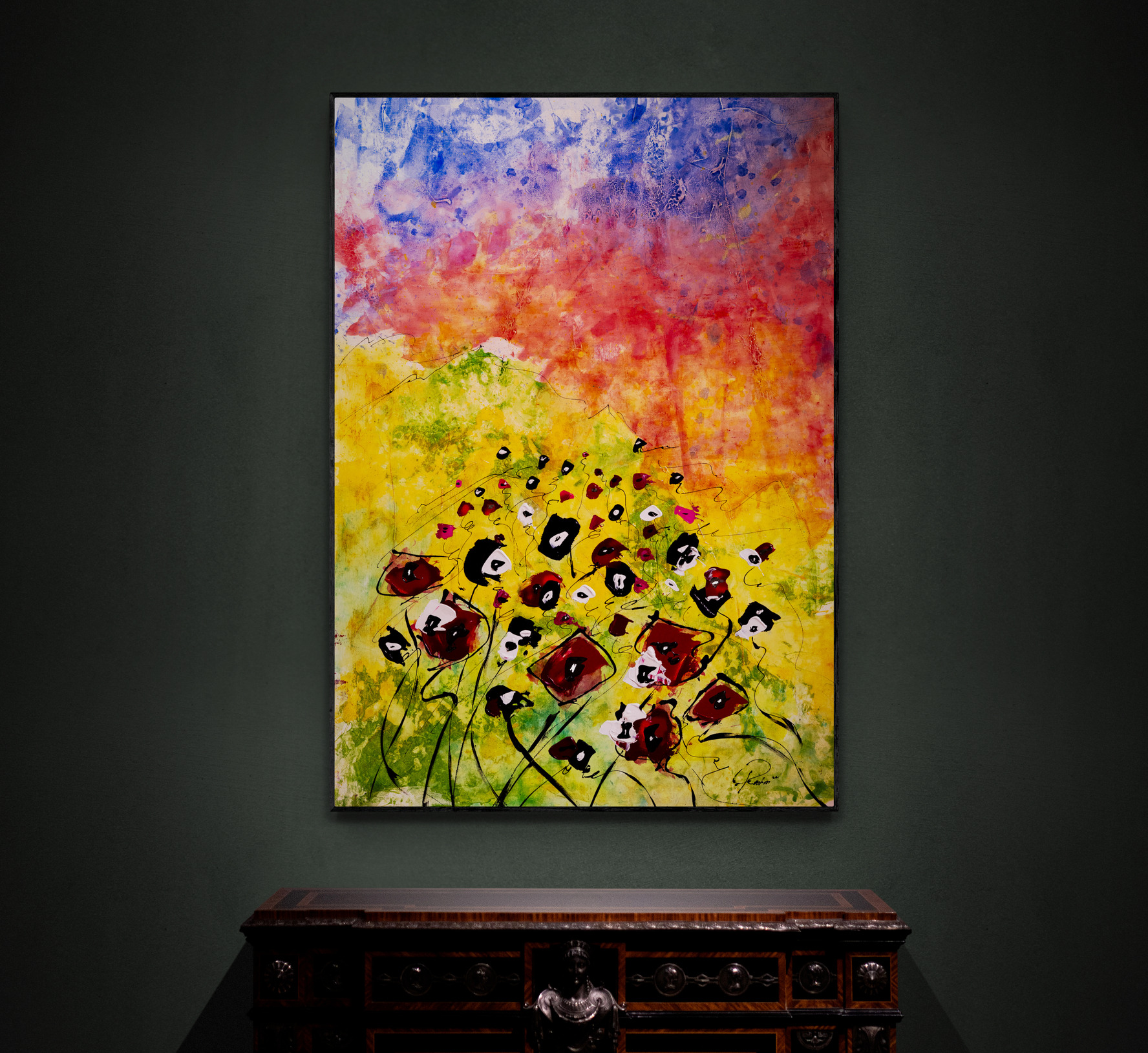 'Archipelago' marks the start of a new style in which I work wet on wet, then throw sheets onto the surface to withdraw enough paint to create subtle design and unique color.