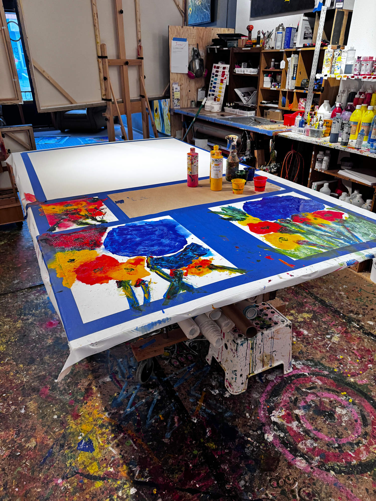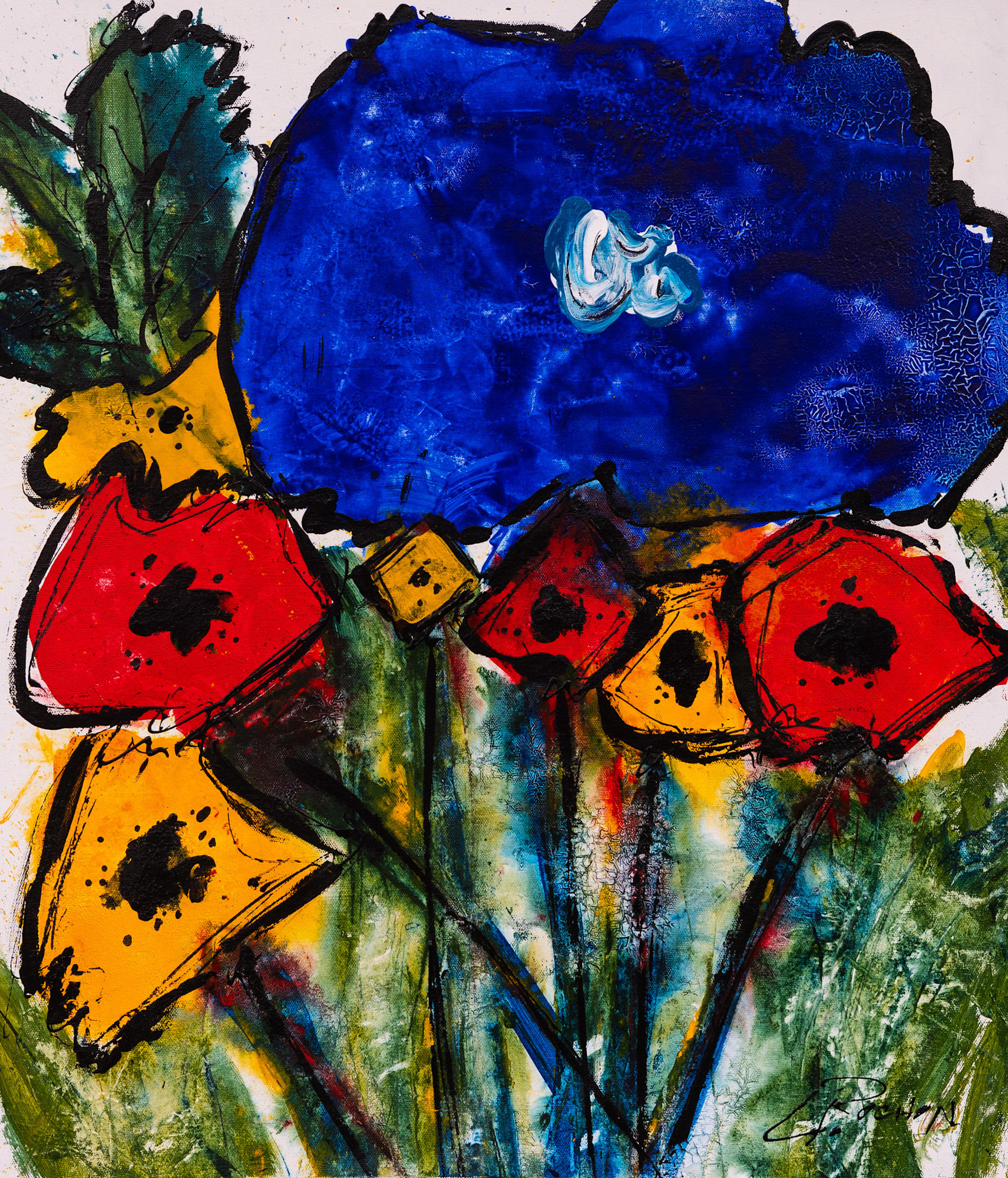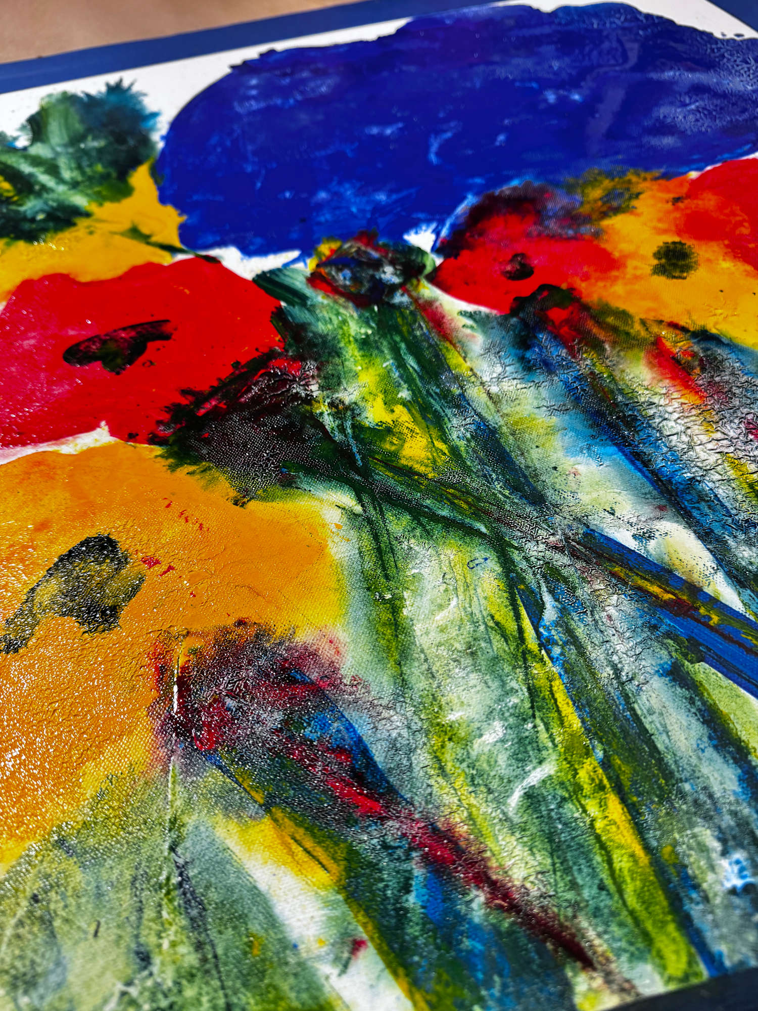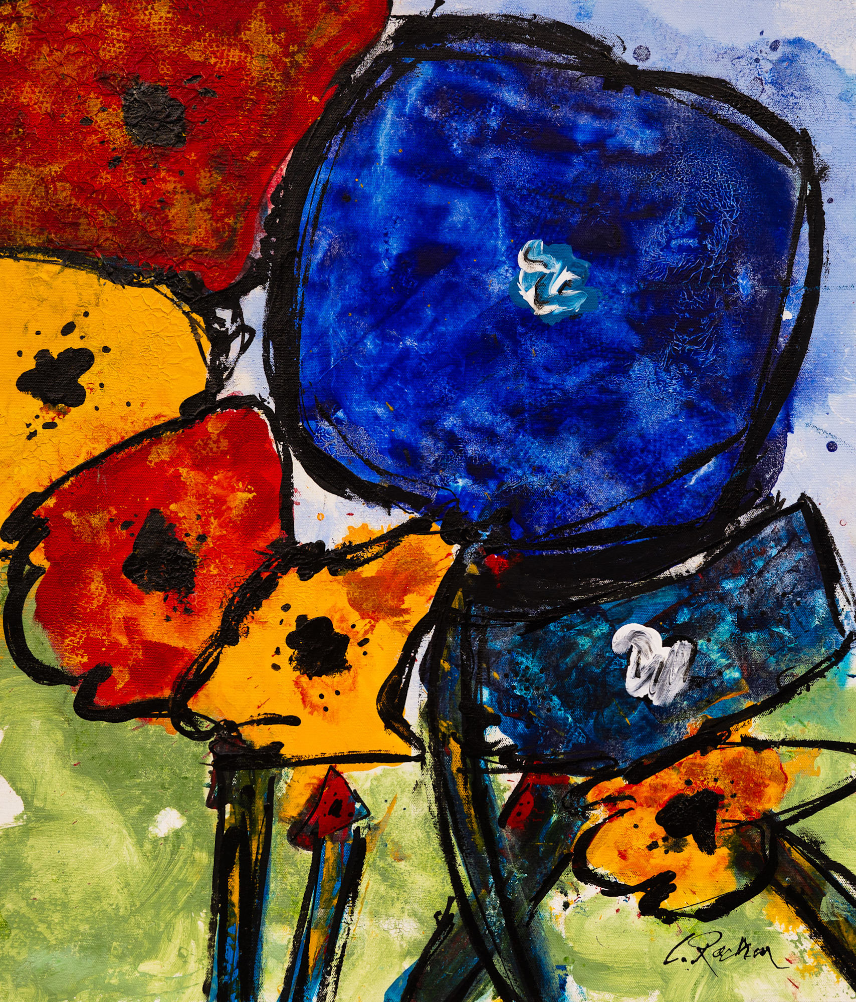 Introducing "Poppy Dance," a delightful explosion of color and vitality! These enchanting pieces invites viewers into a whimsical garden where flowers boogie to their own rhythm. At the heart of this vibrant symphony is a grandiose deep blue flower, reigning from above like a benevolent queen, flanked by a cheerful troop of smaller red and orange blossoms. Each flower is framed by striking black outlines, lending them a crisp, cartoon-like charm that pops against the multicolored background.