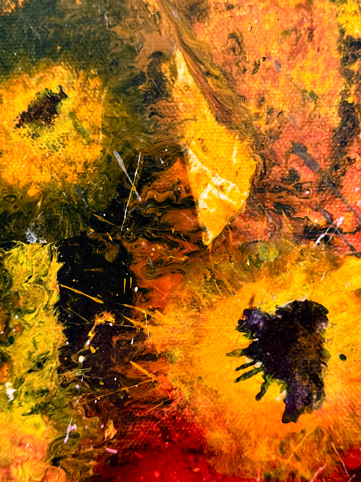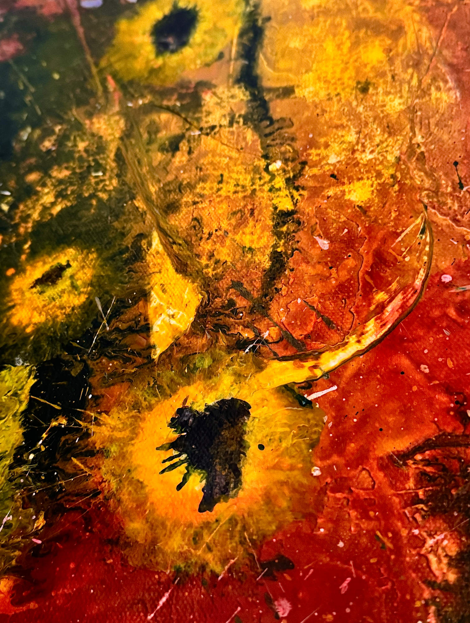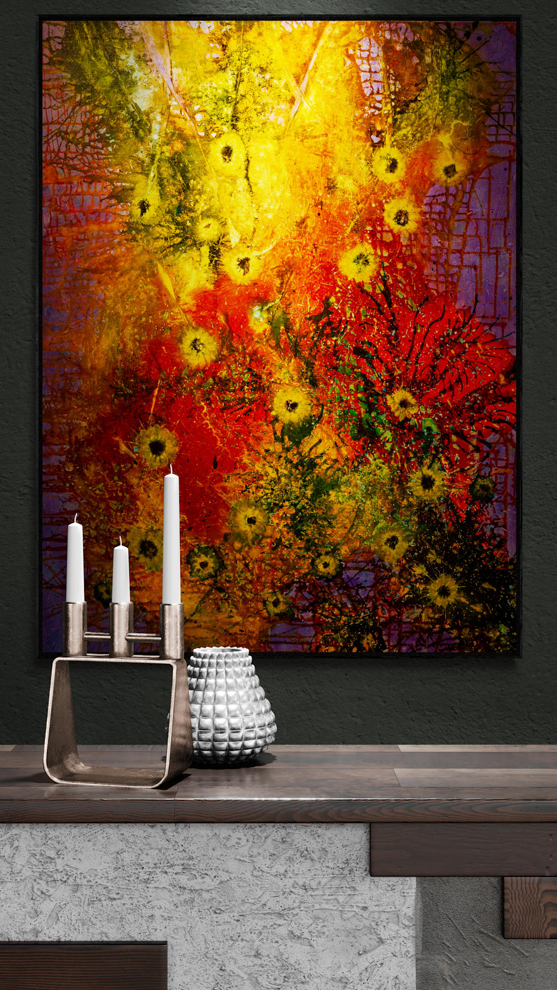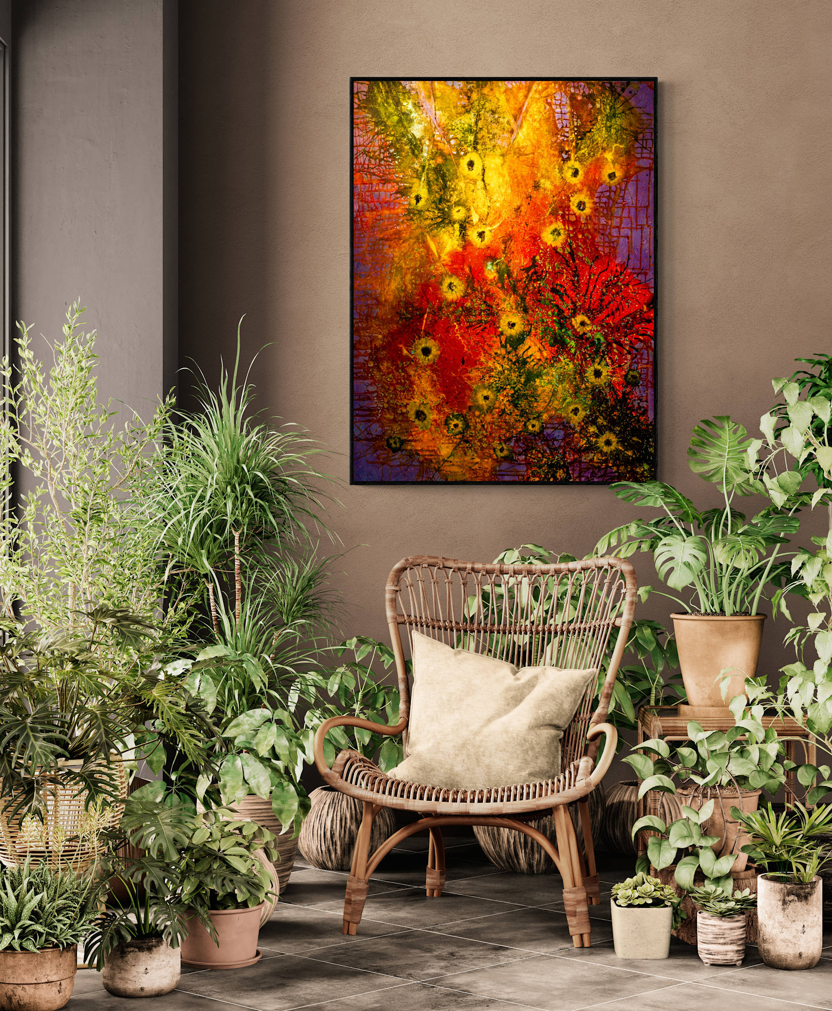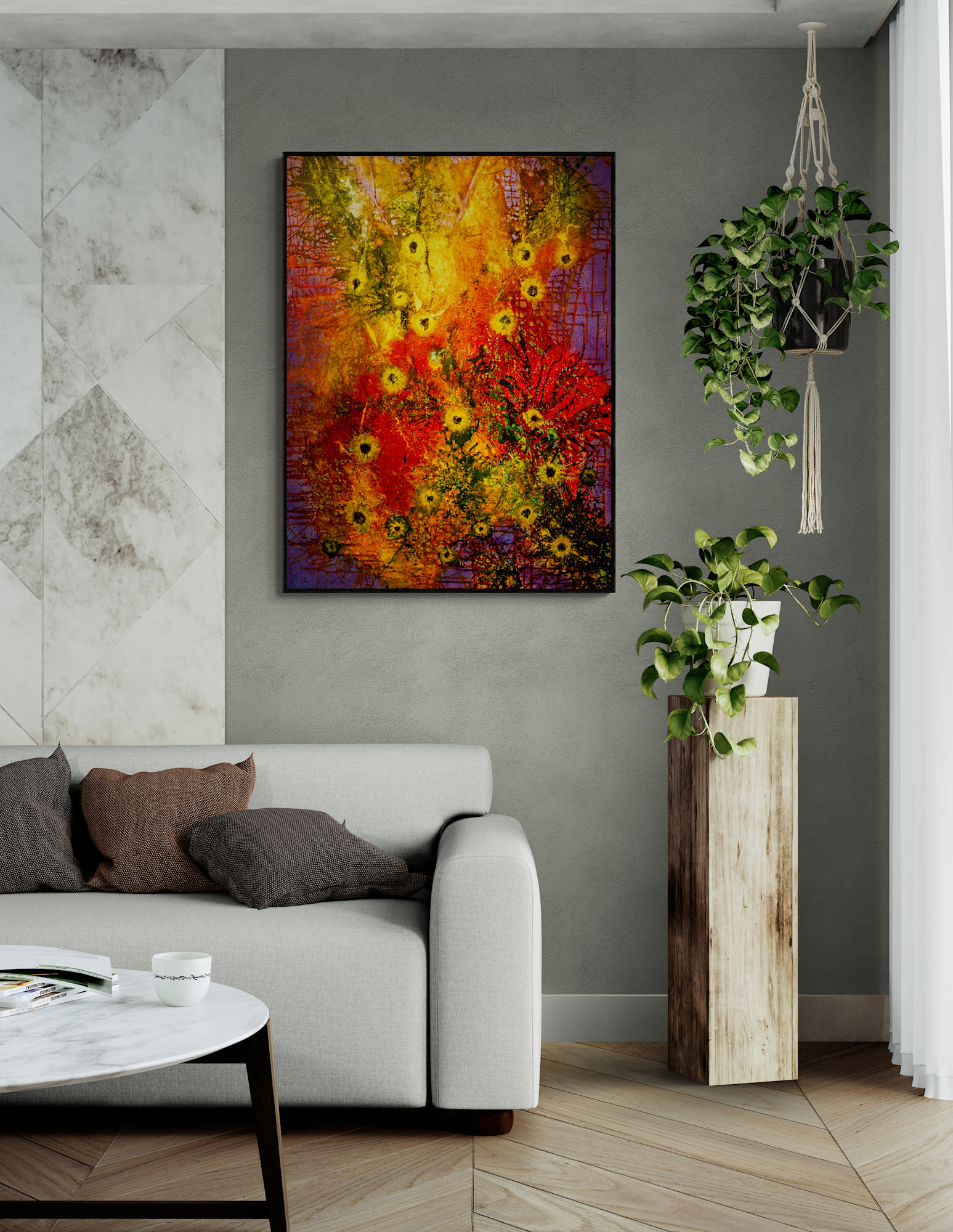 'Purple Haze' ignites the canvas with a surge of emotion—fiery reds, oranges, and yellows blaze like a sunset in turmoil, while radiant yellow blossoms burst forth with wild, untamed joy. Vivid streaks of green, shadowy blacks, and deep purples swirl together, conjuring a storm of passion and movement. The whole piece pulses with life—intense, raw, and electrifying—like a heartbeat you can almost hear.