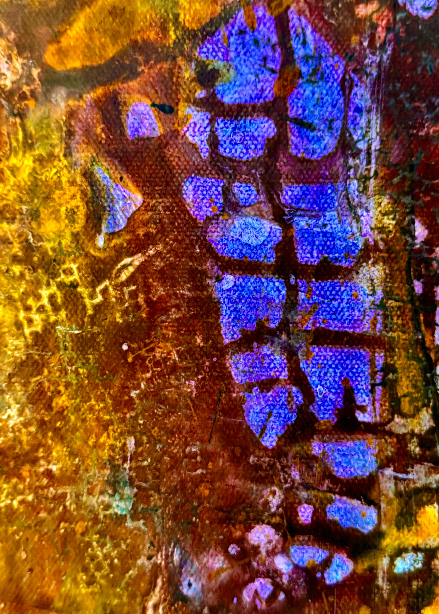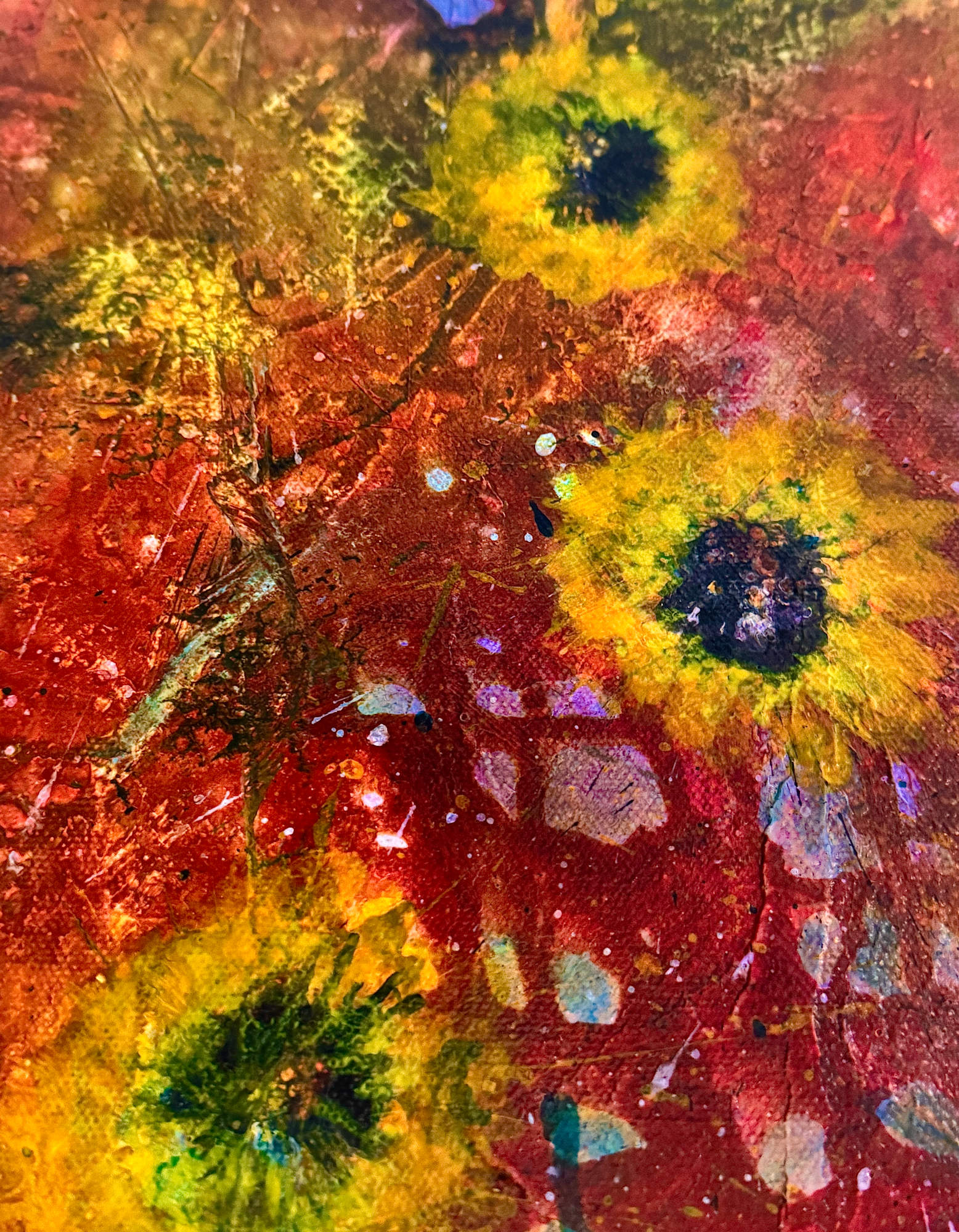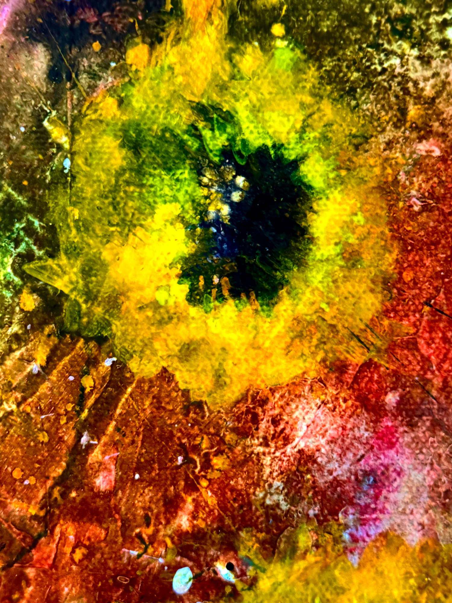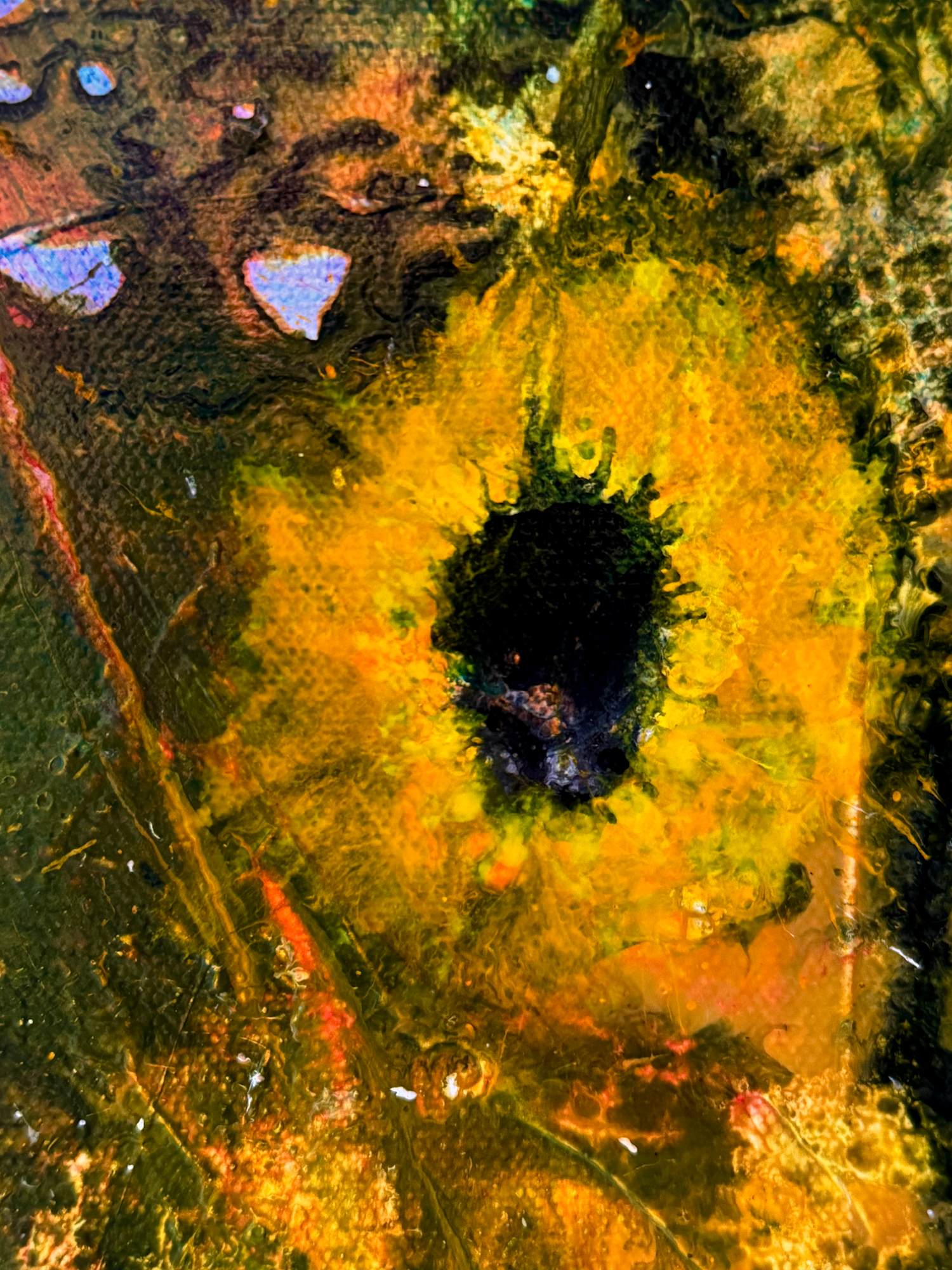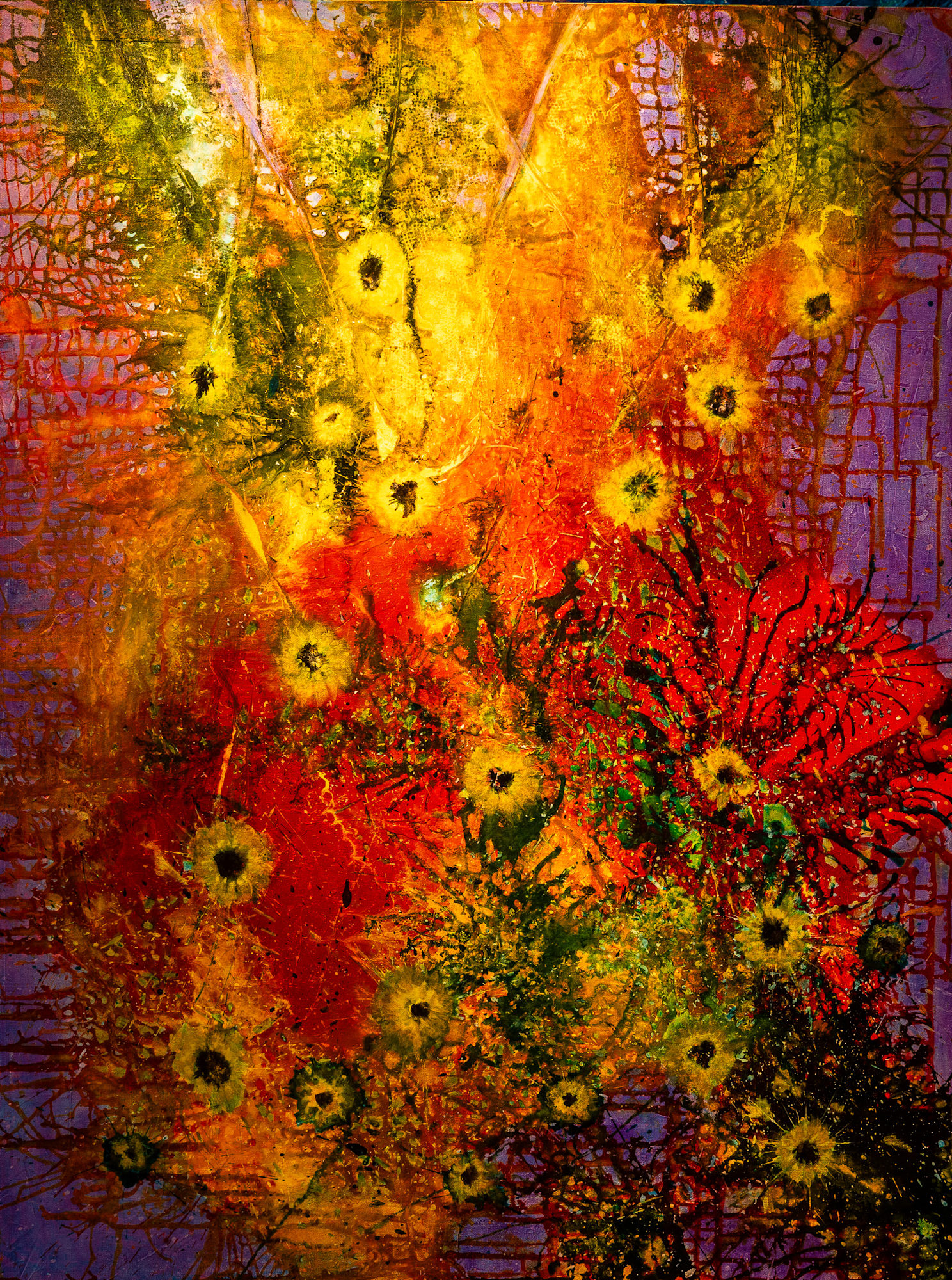 'Purple Haze' ignites the canvas with a surge of emotion—fiery reds, oranges, and yellows blaze like a sunset in turmoil, while radiant yellow blossoms burst forth with wild, untamed joy. Vivid streaks of green, shadowy blacks, and deep purples swirl together, conjuring a storm of passion and movement. The whole piece pulses with life—intense, raw, and electrifying—like a heartbeat you can almost hear.
