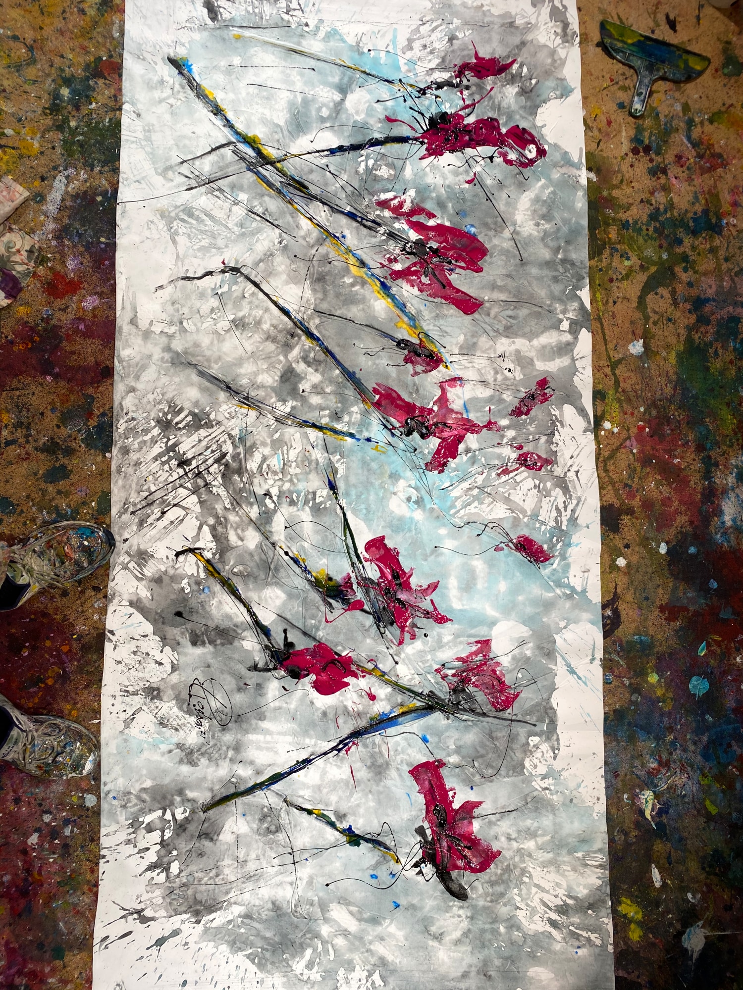 33.5" x 77.5" . Acrylic and Ink on Hand- Stretched Canvas
