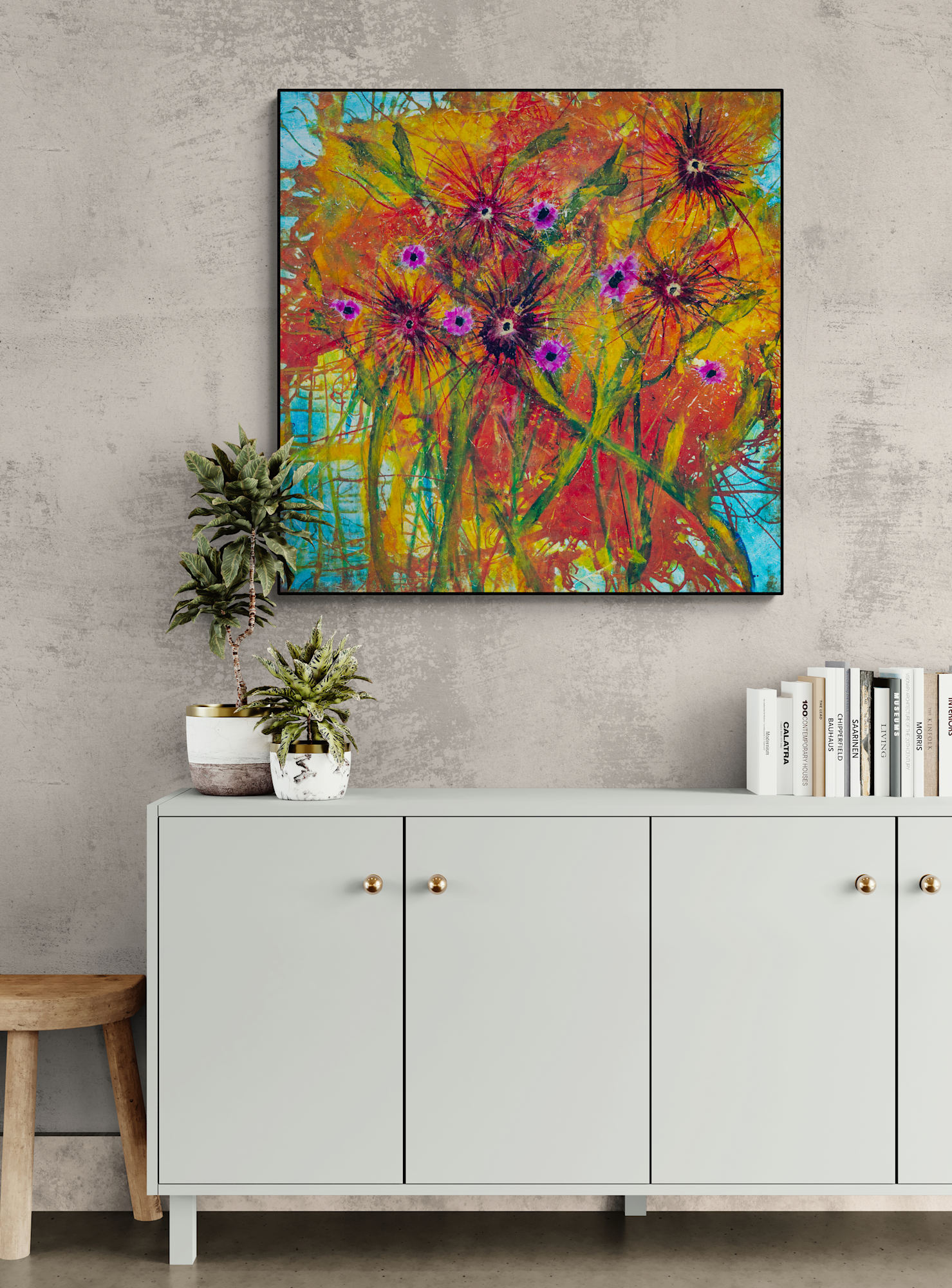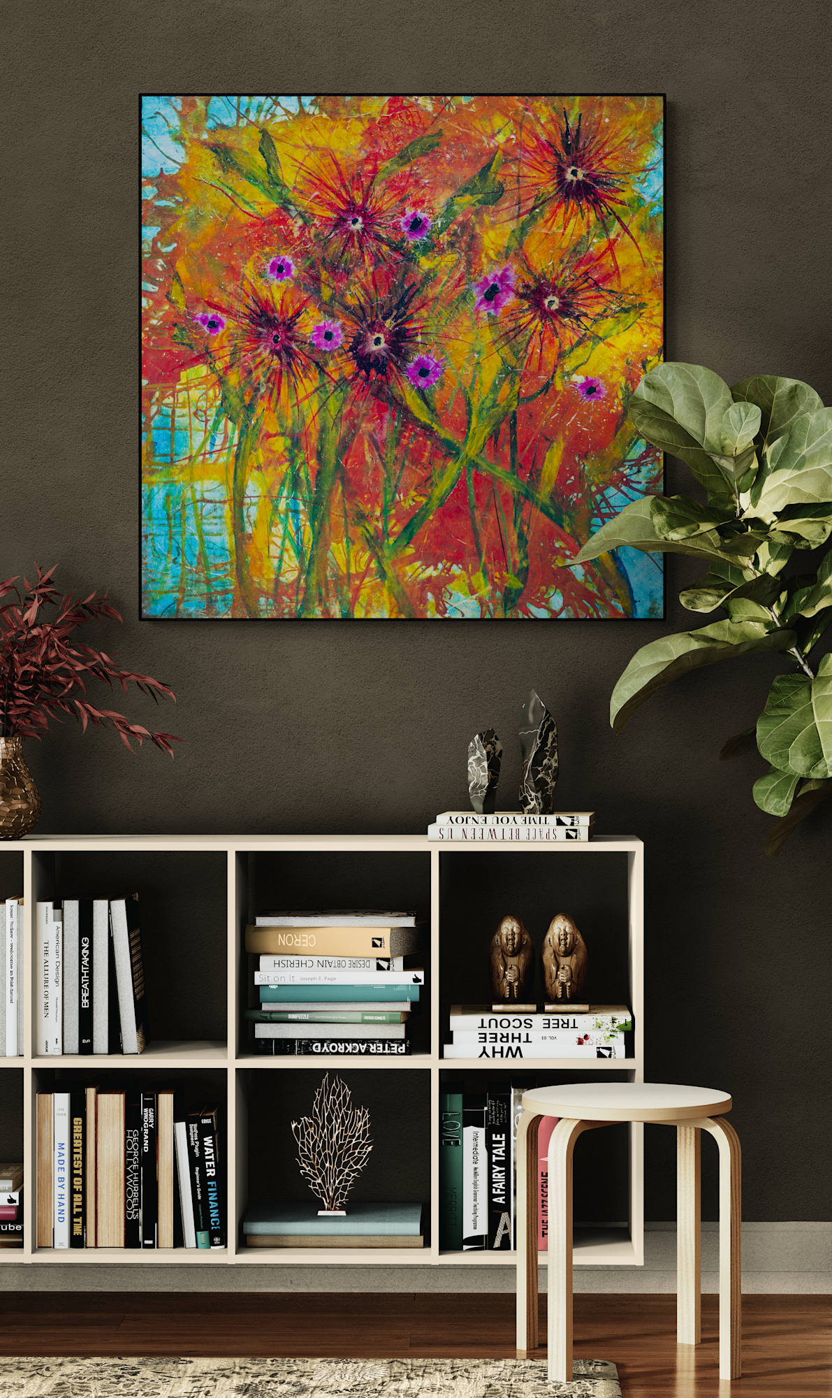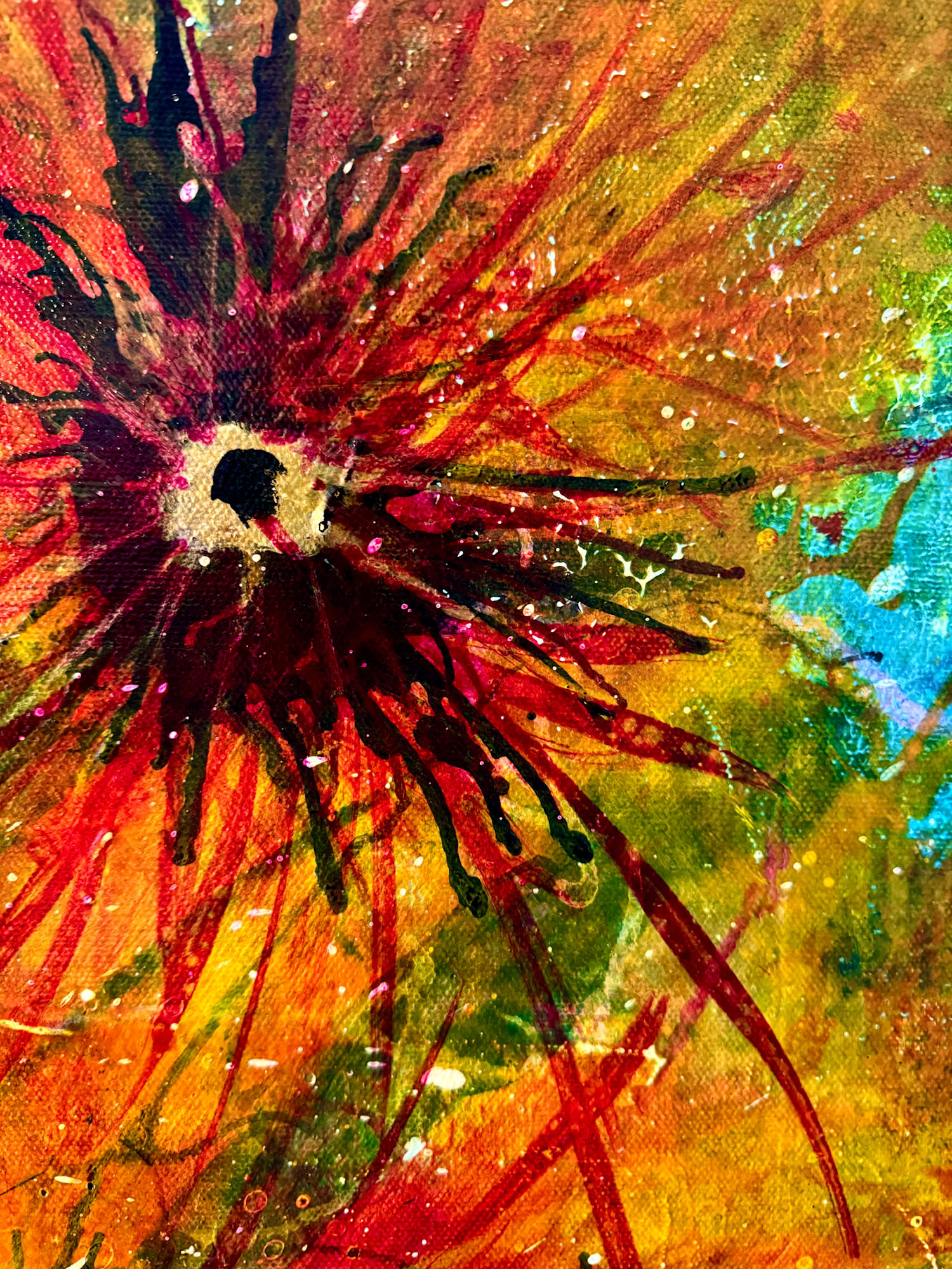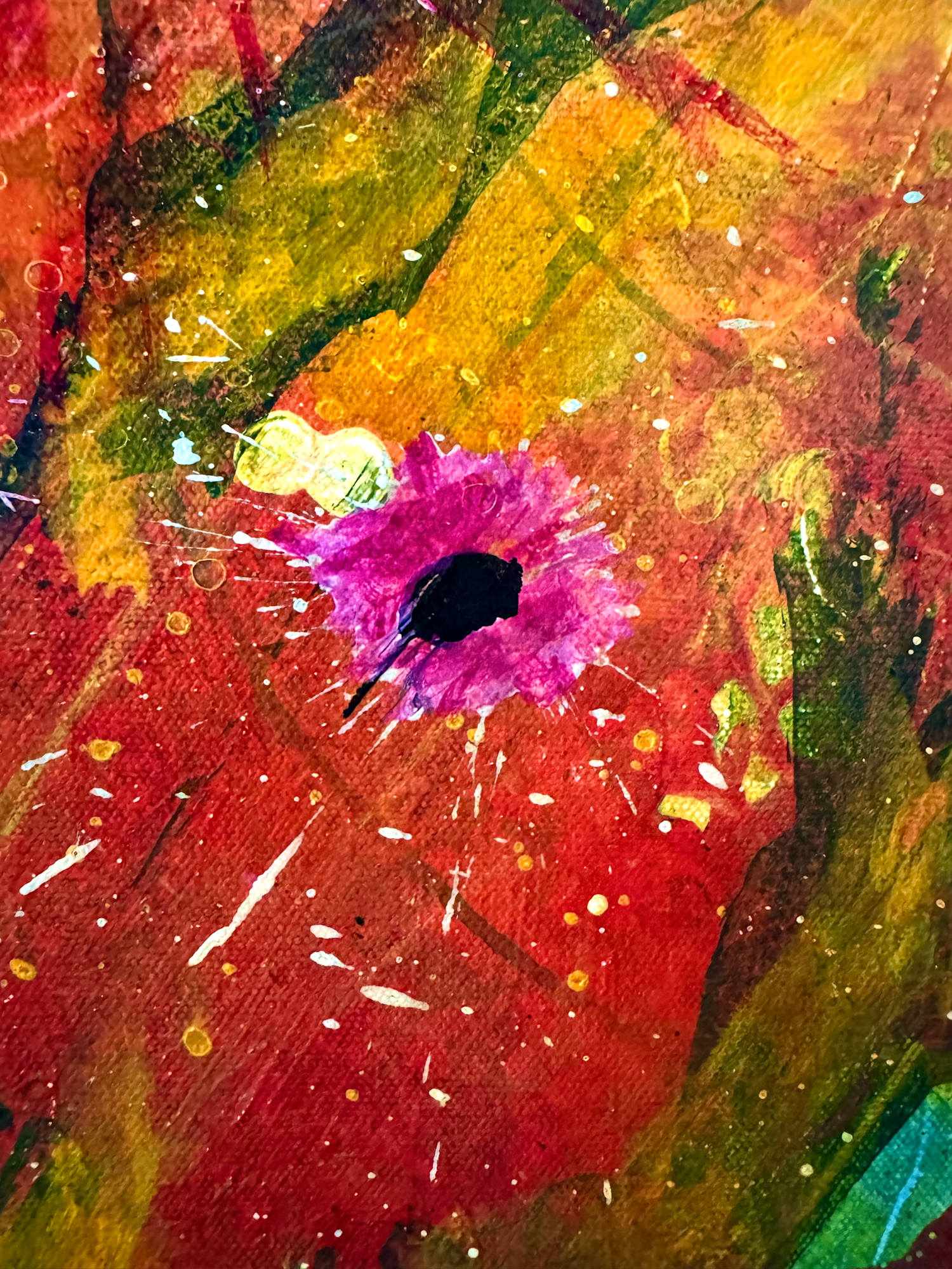 'Serendipity' is pure joy set loose—fiery colors, bold blooms, and wild brushstrokes bursting with life. It feels like sunshine, laughter, and a spontaneous dance all rolled into one. Created with multiple acrylic washes to give a glowing effect.