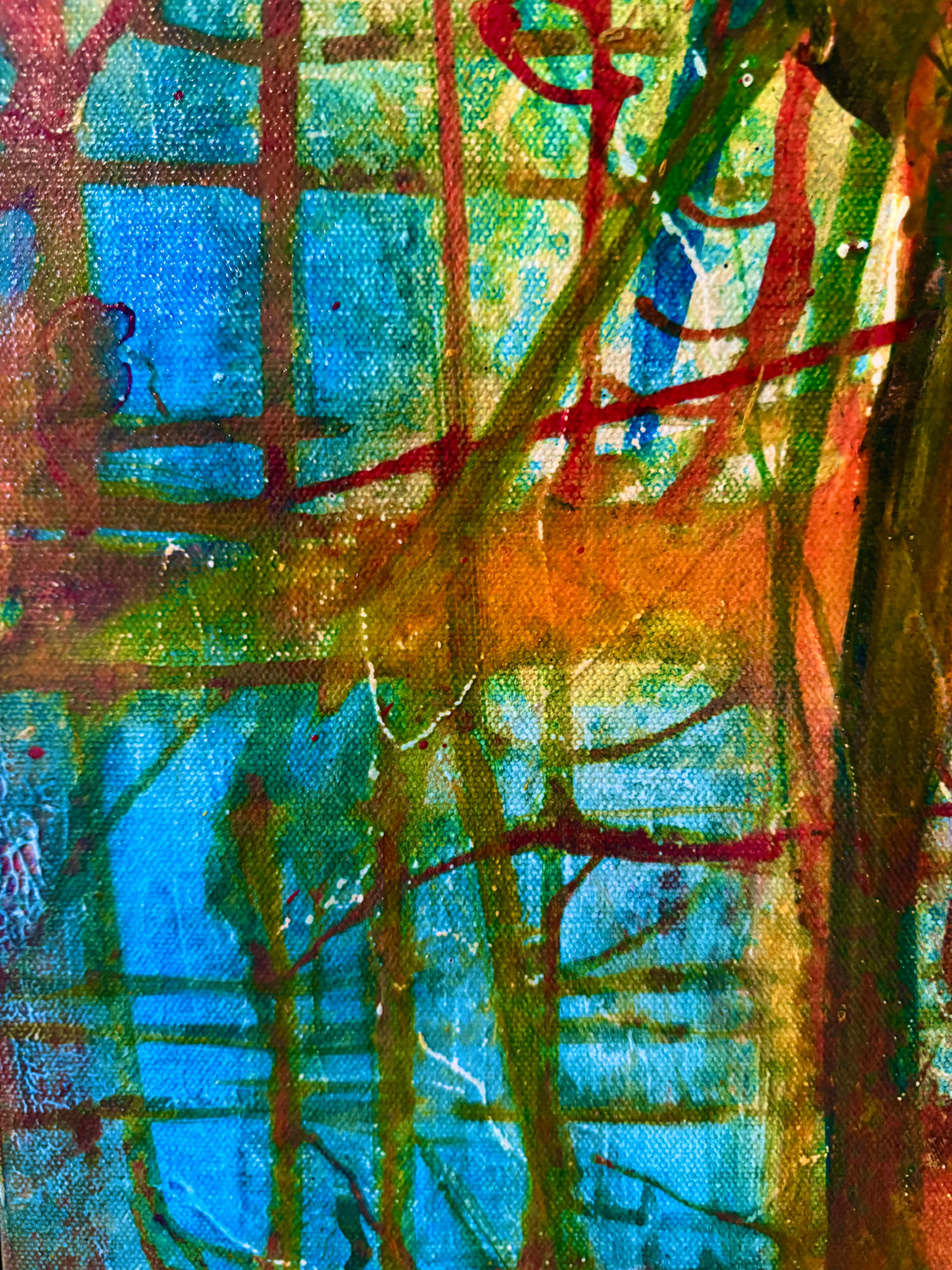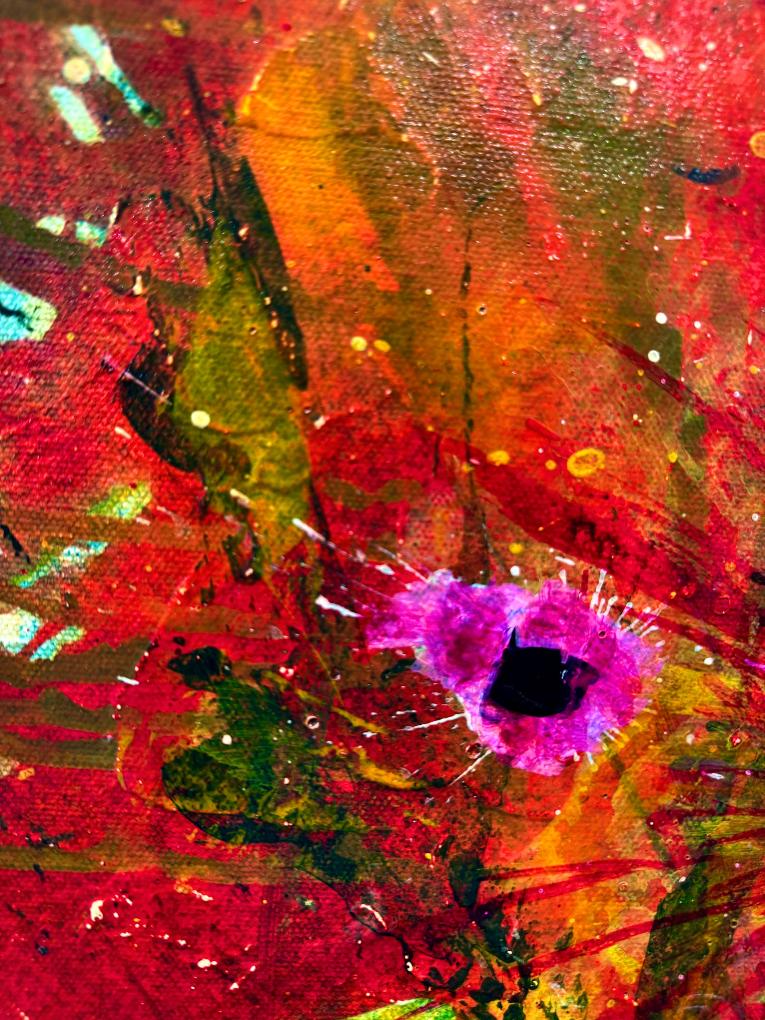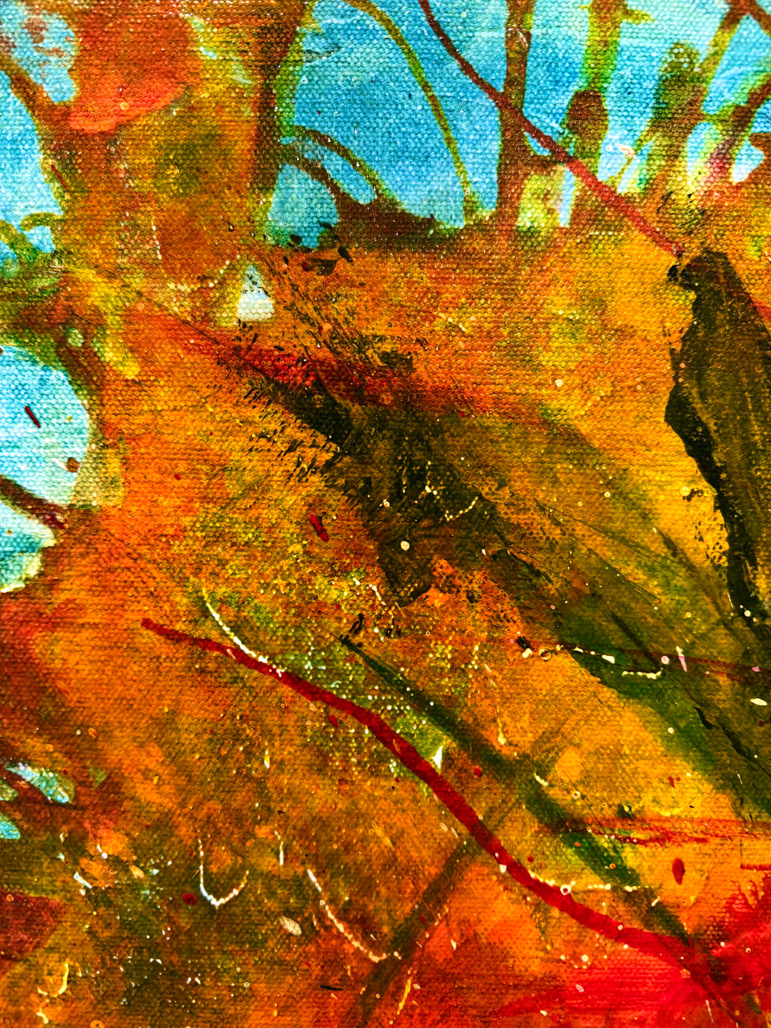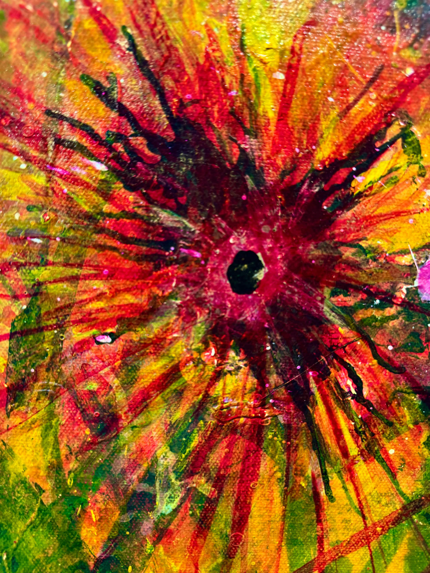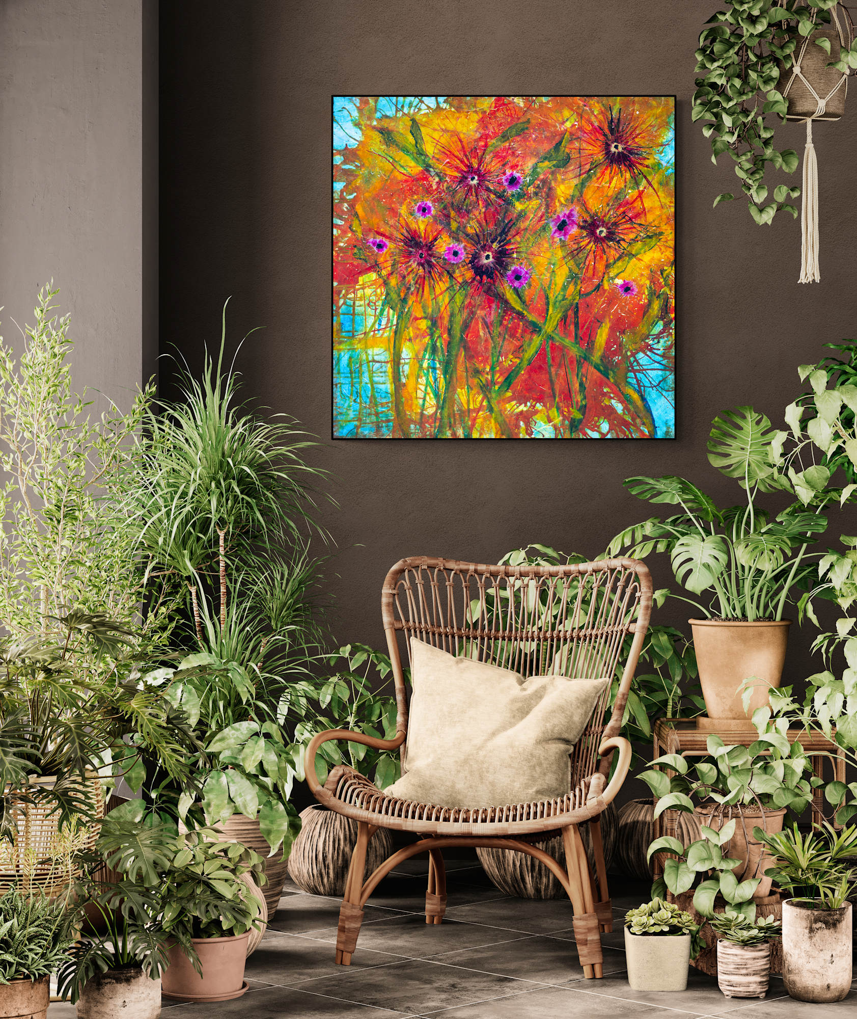 'Serendipity' is pure joy set loose—fiery colors, bold blooms, and wild brushstrokes bursting with life. It feels like sunshine, laughter, and a spontaneous dance all rolled into one. Created with multiple acrylic washes to give a glowing effect.