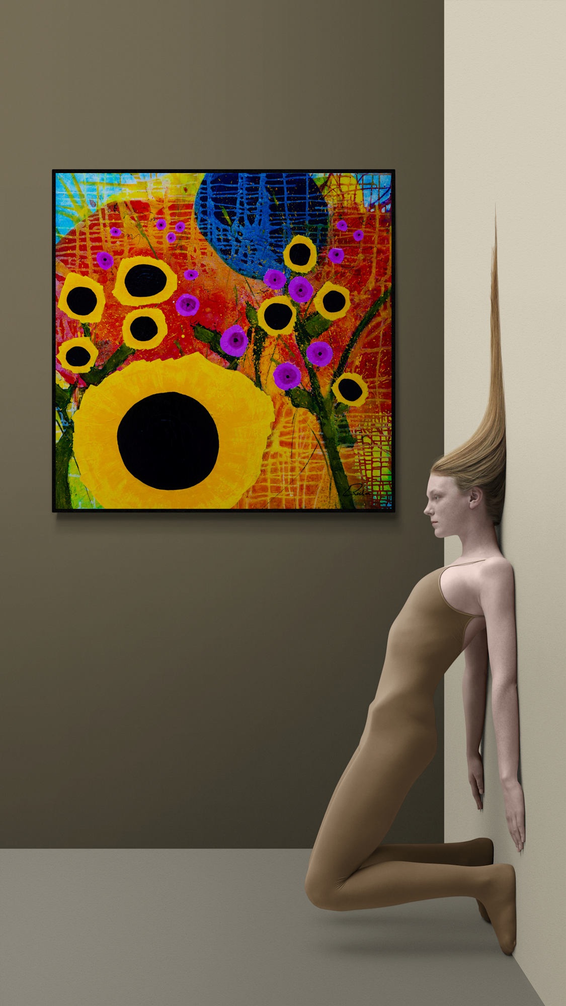 You can't but be happy while experiencing 'Sunny Side Up.' This painting bursts with playful energy. Bold yellow sunflowers and bright purple blooms pop against a wild, textured background of fiery reds, electric blues, and layered patterns. The oversized black centers give the flowers a cartoon-like charm, while the loose brushstrokes and scribbles add a spontaneous, joyful vibe. It feels like summer turned up loud.