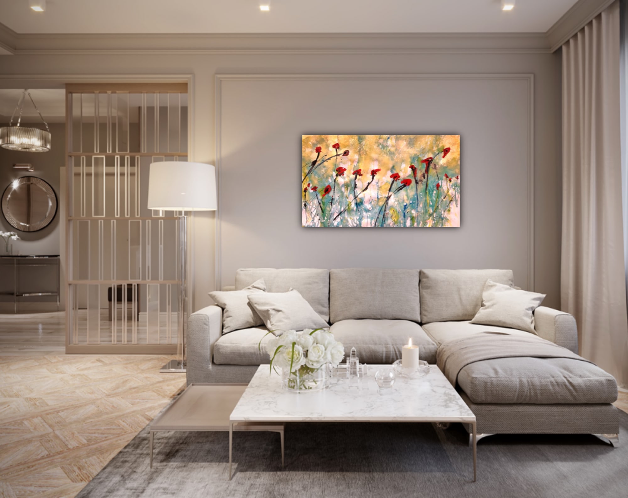 Many of the marks are done by hand after laying down with tip, as I feel they are needed. In the case of 'Wild Roses’, the dense, buttery crimson paint was applied by finger, within perhaps 2 or 3 minutes - it had to be, as the wind was blowing in the painting. I was there and needed to be in sync.