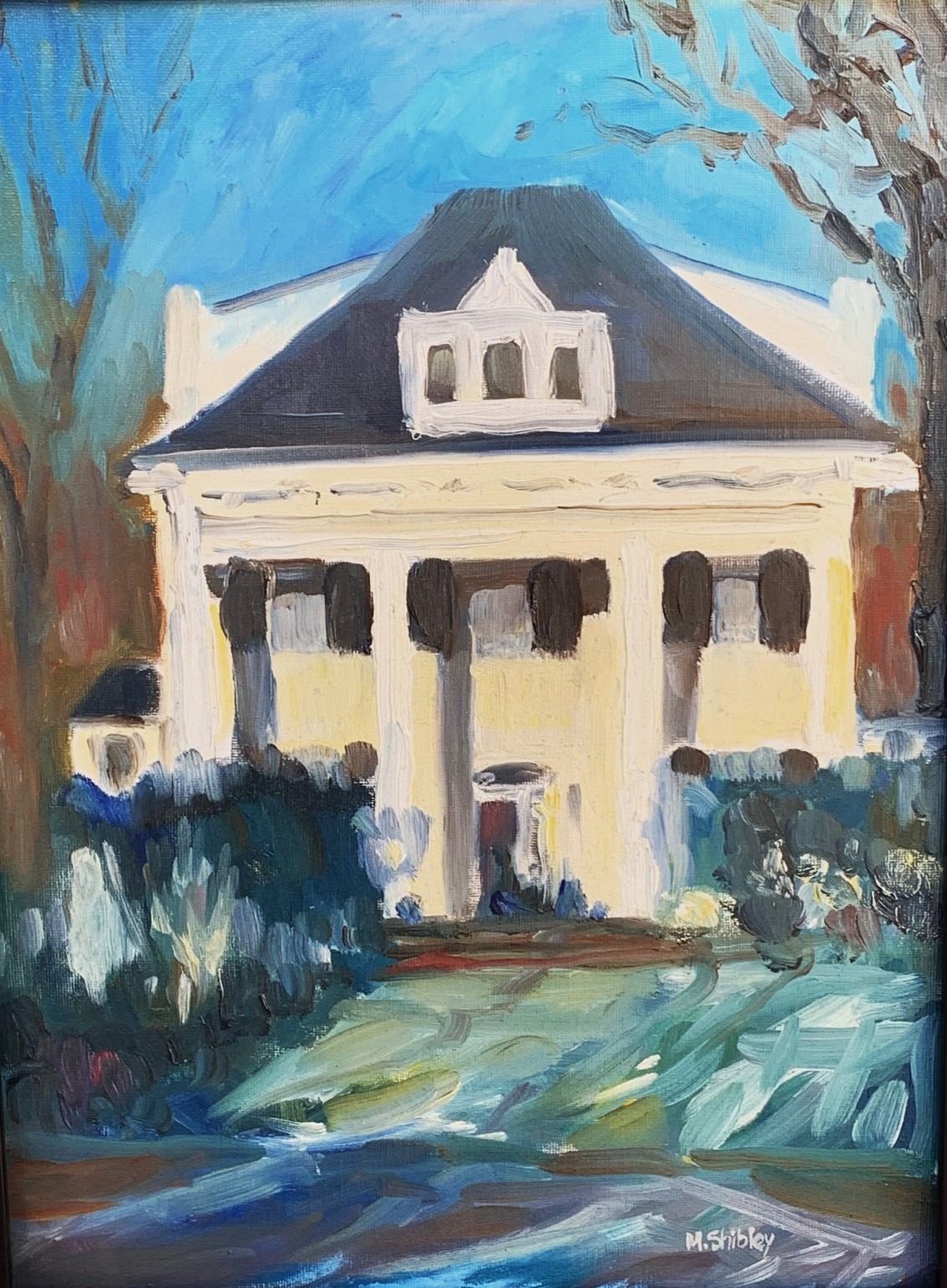 The strong contrasts of light and dark in the cast shadows and the varieties of green in the yard made this an interesting subject.