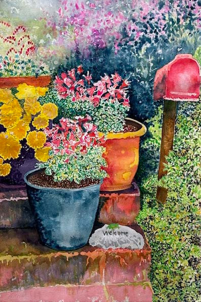 Front Door Stoop with Mailbox and Floral Planters
