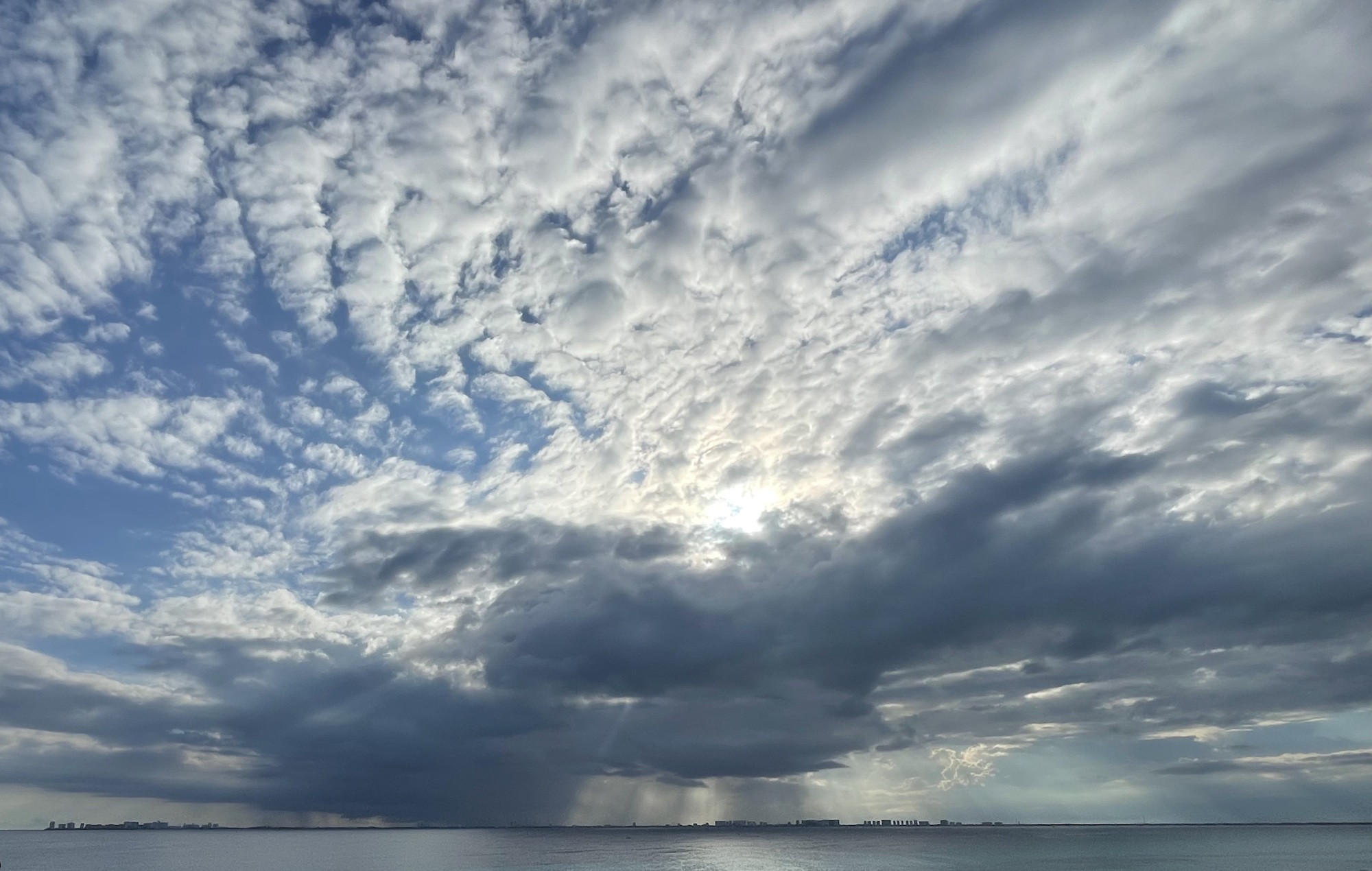 Clouds hovering over Cancun. The cirrus clouds in the image can climb up to 60,000 feet, almost twice as high as a commercial jetliner. In the distance, buildings dwarf in comparison, drenched by the the heavy downpour.