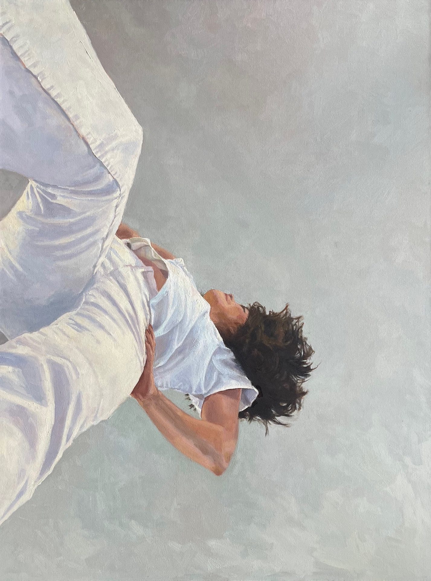 Judge's comments: Probably every instructor I had in art school would tell me that you don’t put your entire subject matter on one side of the canvas and leave the other side blank. It never works, until it does. This bold exciting painting is unexpected and delightful. The legs of the figure take up most of the left side of the canvas and lead you from the corners to just beyond the center, where your eye is forced to see arms, face and hair. Everything about this painting, from direction to color, draws you to this activated area. The bold, painterly brush strokes and light color on the right side offer balance and symmetry with the white jeans. This is a lovely piece.