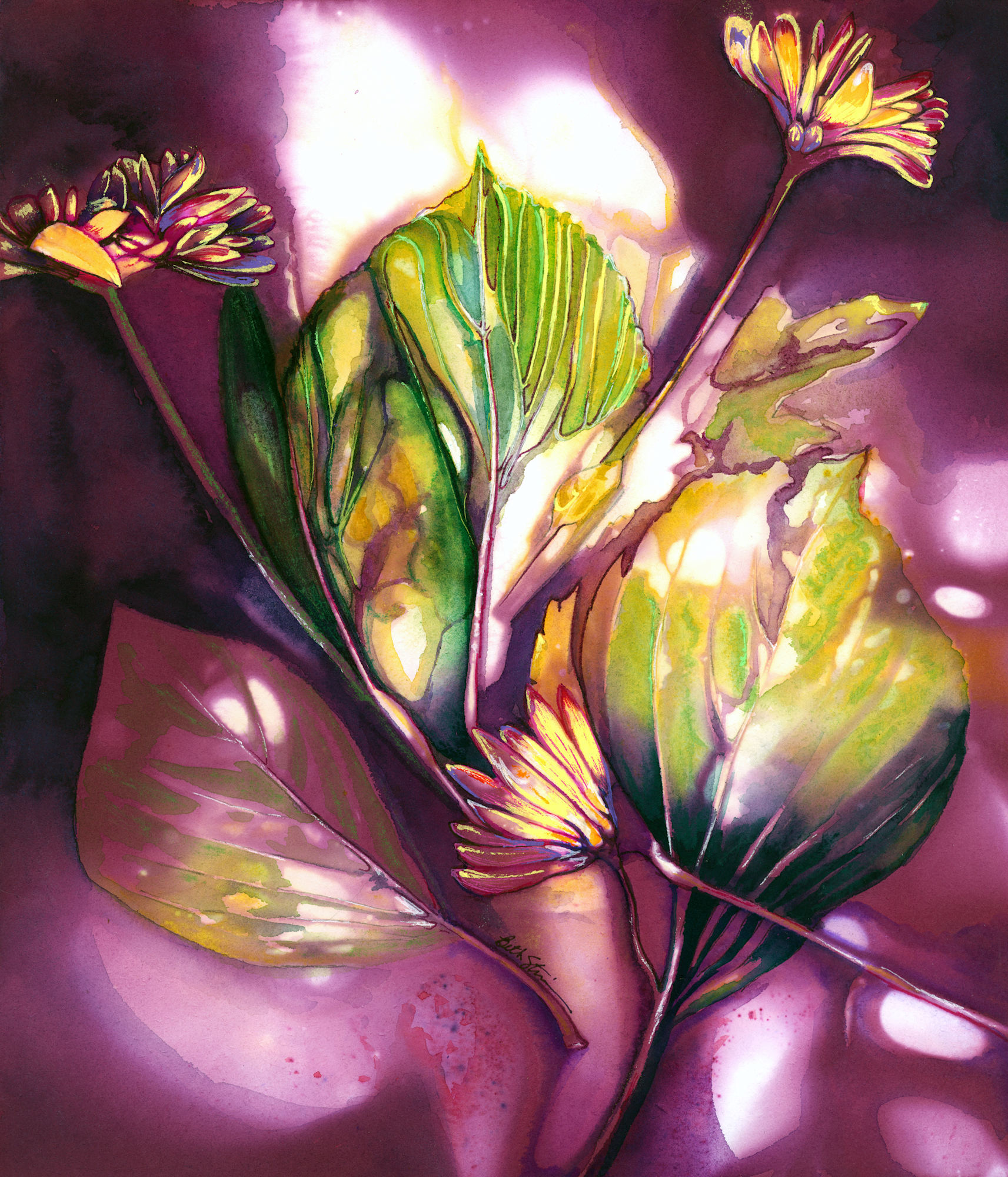 This piece was created using a process I call "echo printing." Actual plant material is pressed between sheets of paper and streamed in a dye bath. I then paint on the results.