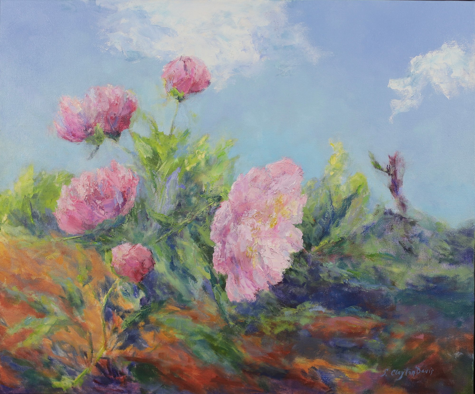 I paint my favorite peonies each year as often as I can each year. I set up and painted outside for this painting. I enjoy having flowers meet the sky.