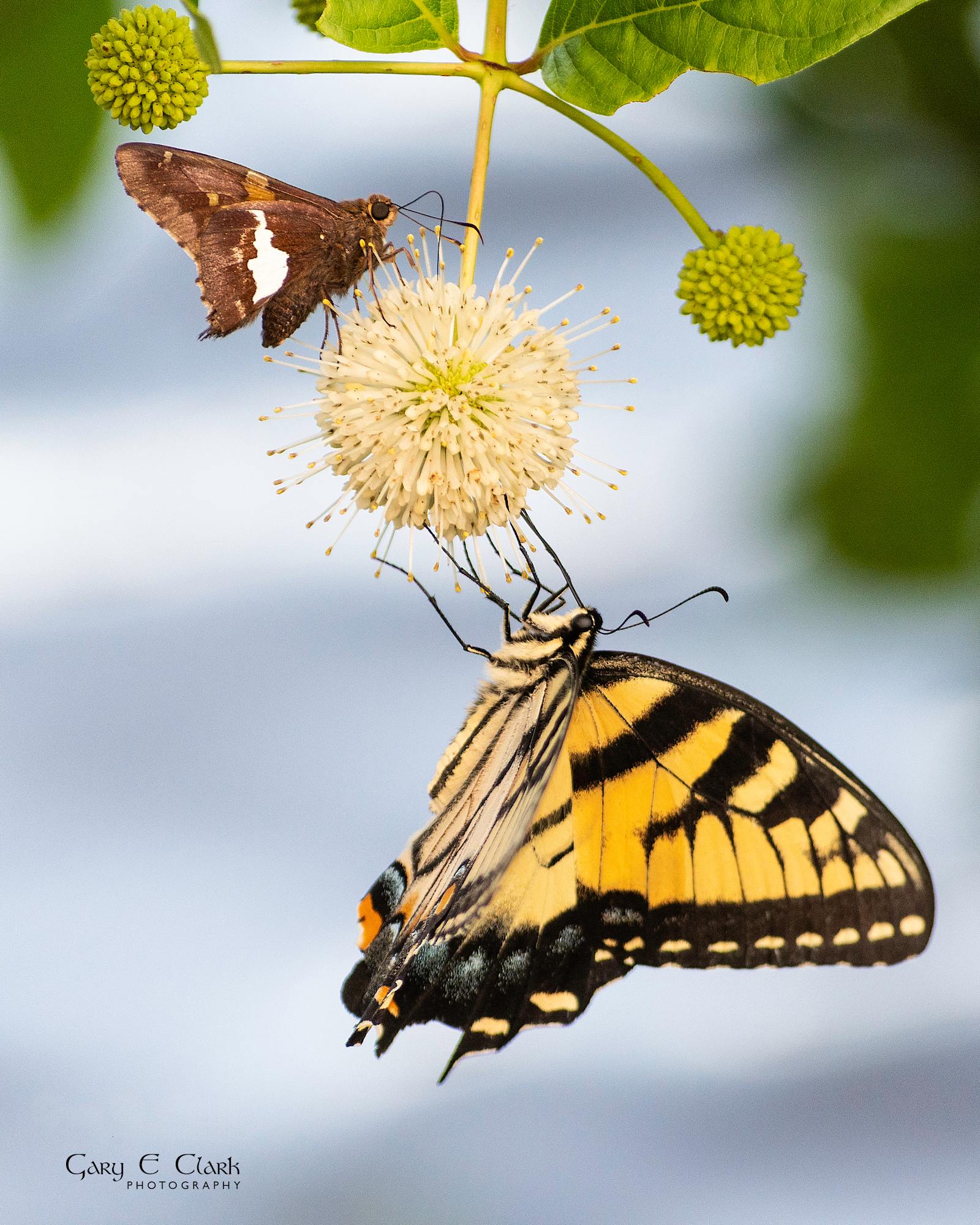 A silver spotted skipper and an Eastern Tiger Swallowtail share a Buttonbush.