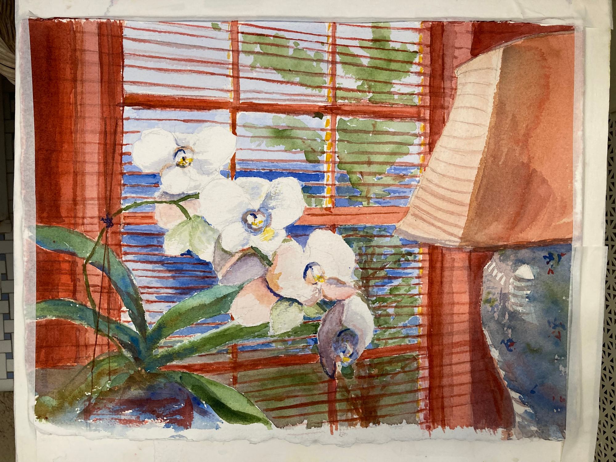 Our orchid finally bloomed after two years and I like how it looks by the window with the red venetian blinds and the blue outside. The shadow on the lamp too.