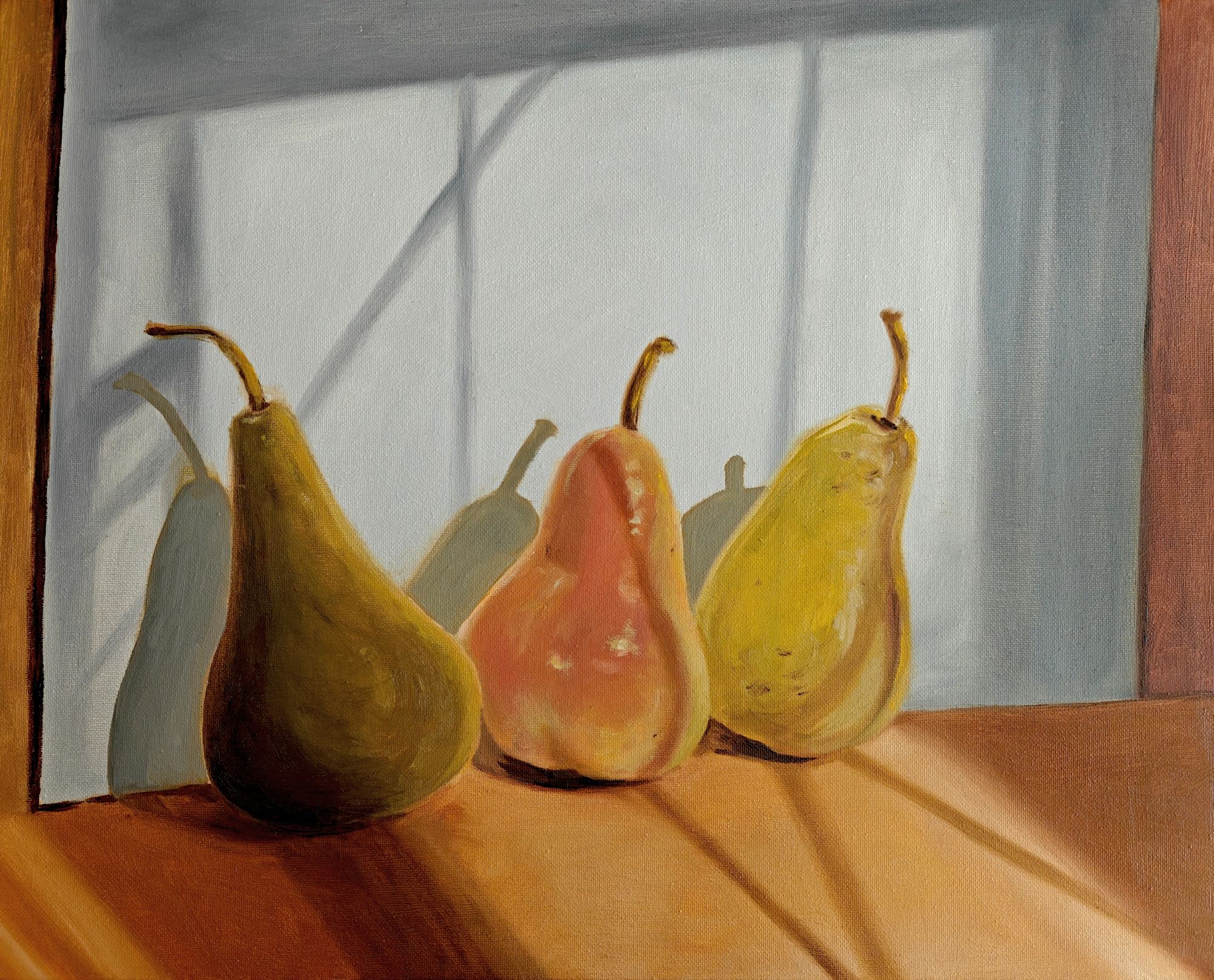 One day the weather was so good. The sun lights shined through the kitchen window and landed on the pears I just bought. I was inspired by the light and rich colors created. The shadows looked like dancing and acting. I recorded this moment with oil paints.