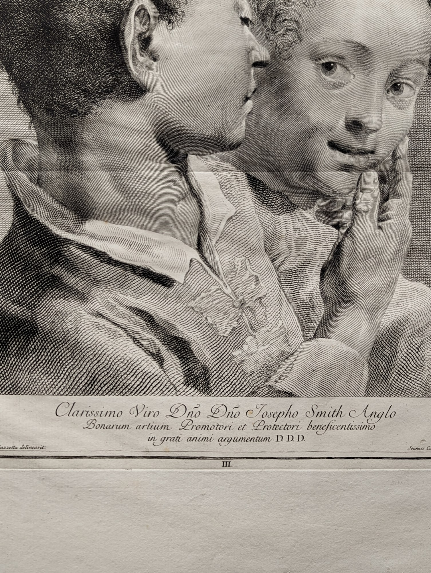 A set of 14 prints by Cattini after drawings by Piazzetta was first published in 1743 by the Pasquali Press as the Icones ad vivum Expressae [Images taken from Life]. The set was reissued in 1754, 1763 and 1767, though the final edition included only eight prints. Cattini trained with the influential Venetian engravers Giovanni Antonio Faldoni and Marco Alvise Pitteri, adopting their technique with little cross-hatching. Each print in the set was dedicated to a wealthy Venetian nobleman or collector: this one is dedicated to Smith himself. Some of the drawings were in Smith's own collection, though this one has not been traced.
