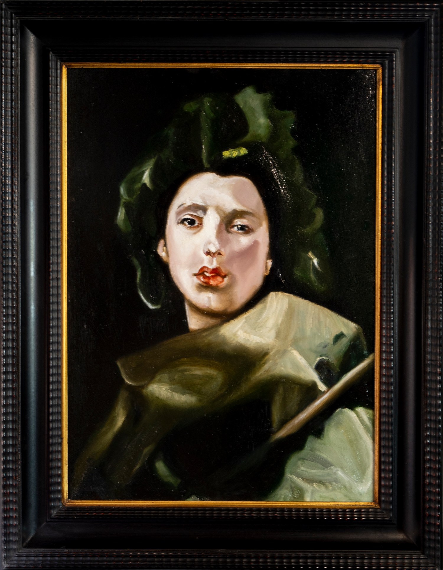 Romijn skillfully mirrors Mancini’s characteristic impasto and dynamic brushwork, while introducing a modern sensibility to the portrait’s execution. The figure’s striking red lips and the intricate folds of the drapery evoke a sense of movement and life, encapsulating the mythical aura of the young god of wine. Painted on a wooden panel, the artwork reflects both the classical tradition and Romijn’s contemporary vision.