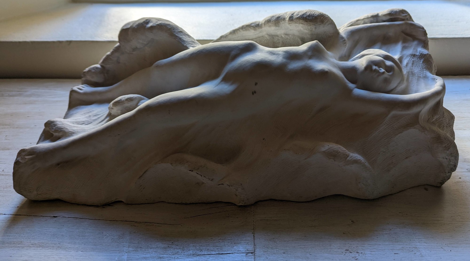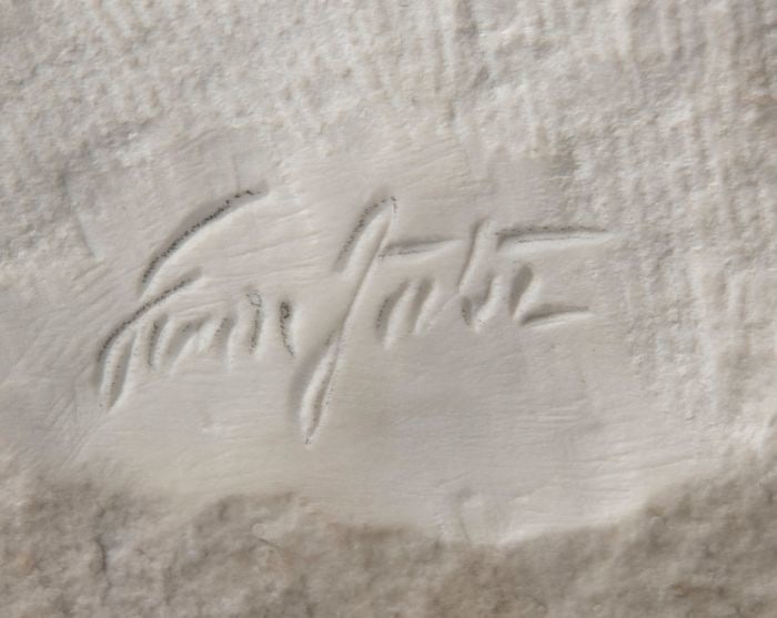This impressive carved culpture is signed on the back. The waves are beautifully sculpted and flow over the woman's body.