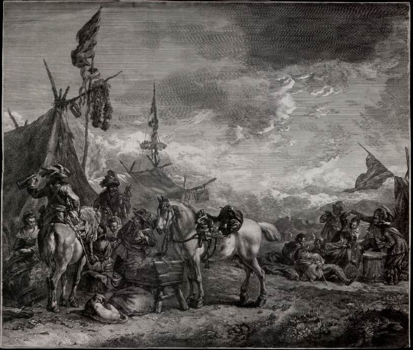 A military camp with a horse at a trough filled with hay and a cavalryman, seen from behind, holding a tankard; at right a group of soldiers relax together, one drums, another pipes and a couple dance; proof before letter; after Philips Wouwerman Engraving and etching.