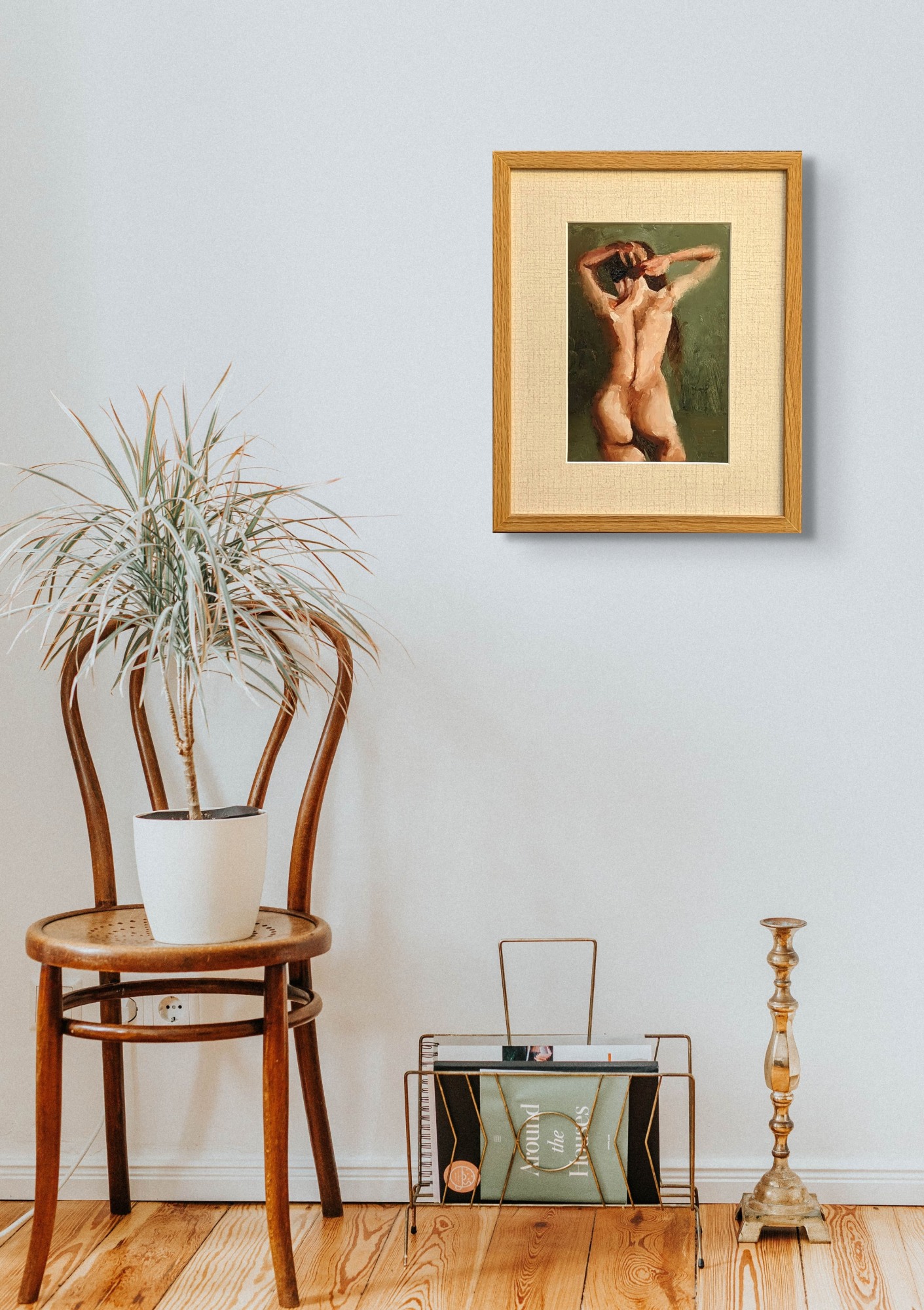 The artist's brushwork is expressive and dynamic, adding texture and movement to the composition. The choice of a muted green background is a deliberate one, providing a stark contrast that allows the warm tones of the skin to stand out, highlighting the natural beauty of the human form. This backdrop also evokes a sense of tranquility and the natural world, perhaps suggesting a connection between the subject and the environment.
