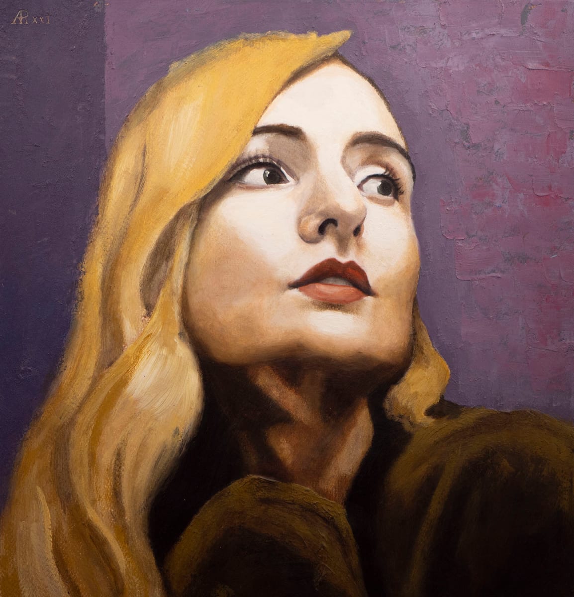 Original artwork by André Romijn. Portrait in oil and cold wax of a youg lady. Apparently she is waiting, but for what? The end of the pandemic? Waiting for her appointment? Waiting for…? The choice is yours.