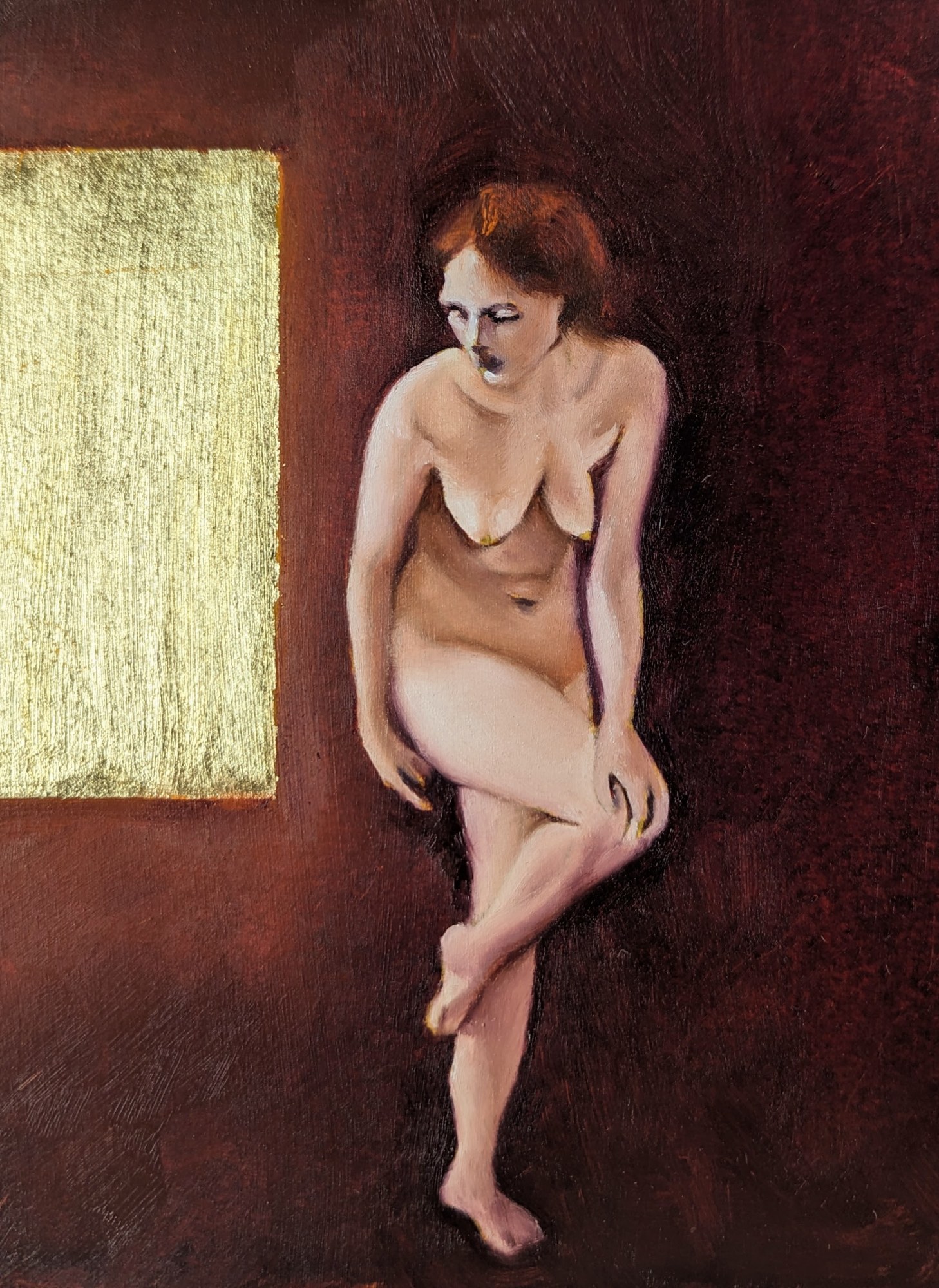 Bathed in the gentle embrace of golden sunlight filtering through a grand window, she leans, a silent silhouette of anticipation. Every curve and shadow whispers tales of ancient loves and forgotten lore. As the world outside continues one can't help but wonder: is she hiding or waiting?