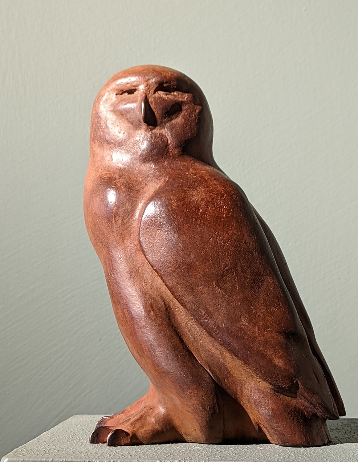 The patina of the bronze lends a rich, tactile quality to the owl, with its warm, earthy tones echoing the natural colouring of the bird's feathers. The light plays across the sculpture, highlighting the contours of the owl's body and creating a dynamic interplay of highlights and shadows that give the impression of a creature at rest, yet fully aware of its surroundings.