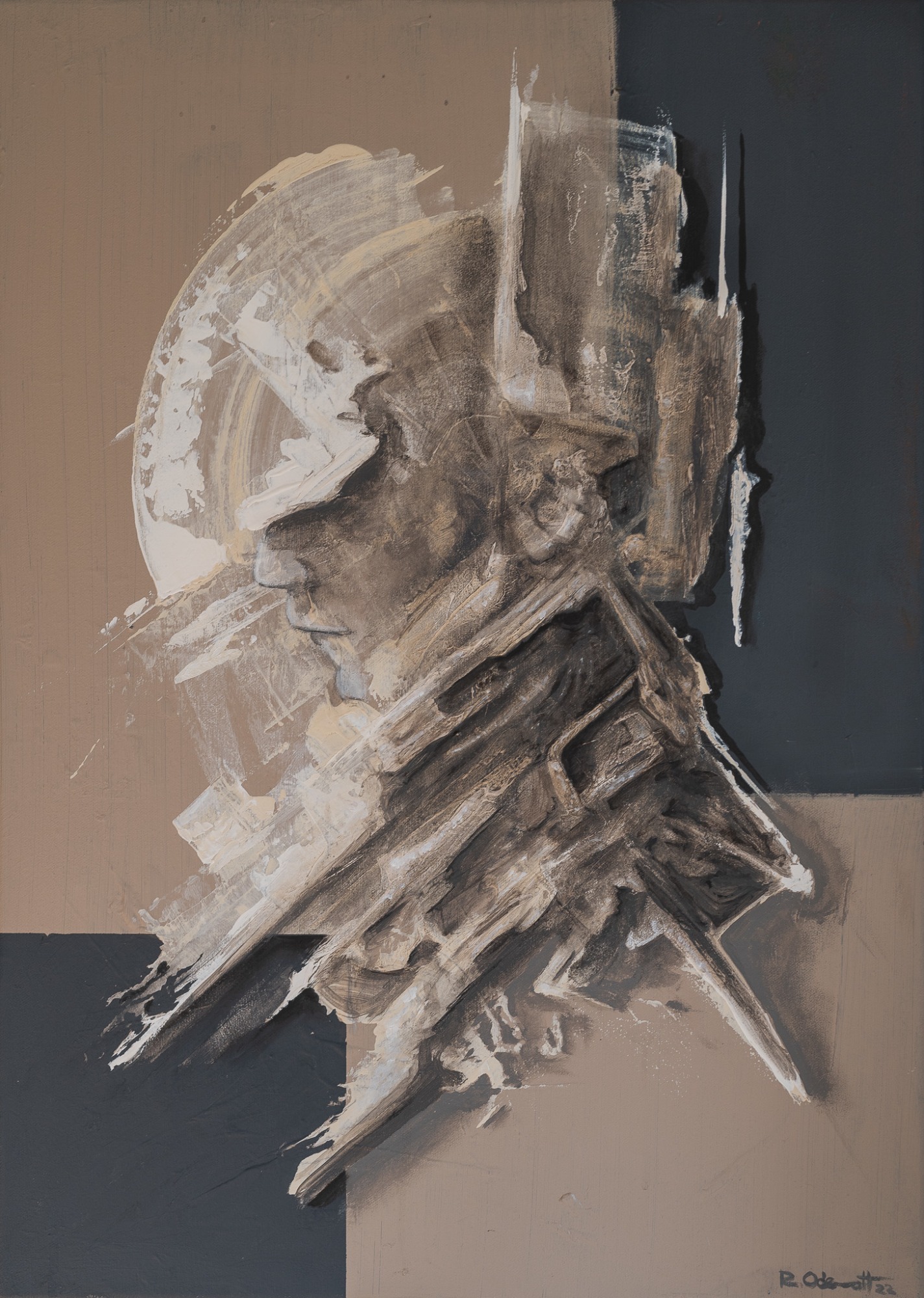 Die dunklen, tiefen Töne verschmelzen mit feinen Strukturen und lassen die Konturen nur erahnen. Wer ist diese Gestalt? Ein Schatten aus der Vergangenheit, eine flüchtige Erinnerung oder eine verborgene Identität?