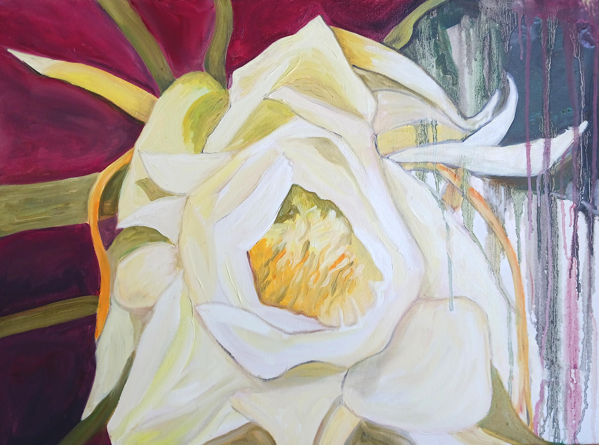 Around the bloom, I added some loose, abstract shapes in muted greens and beiges—think of them as the flower’s chill, organic hangout spot. On the right, you’ll spot a few paint drips sneaking in, adding a bit of playful movement, like the flower’s not just waking up, but dancing a little too. The maroon background? It’s my way of making sure the flower really steals the spotlight without shouting.