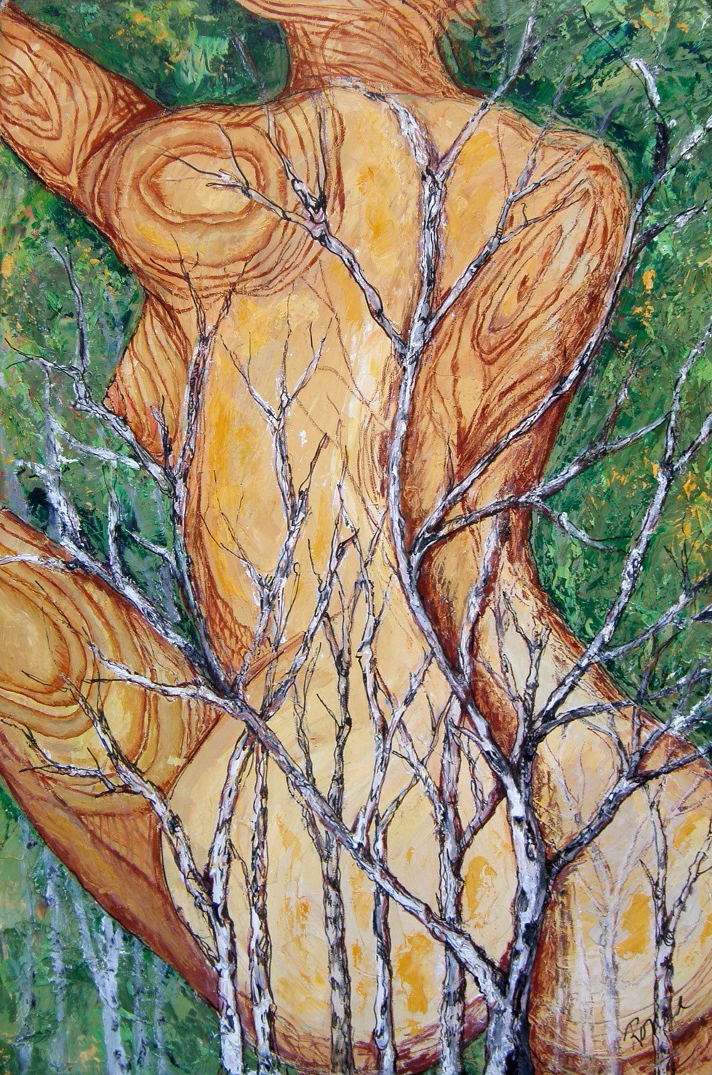 The tree sprouts beneath the torso and has taken on the shape of the human form, a departure from the other trees the artist has created, which have the figure obscured by the trees.