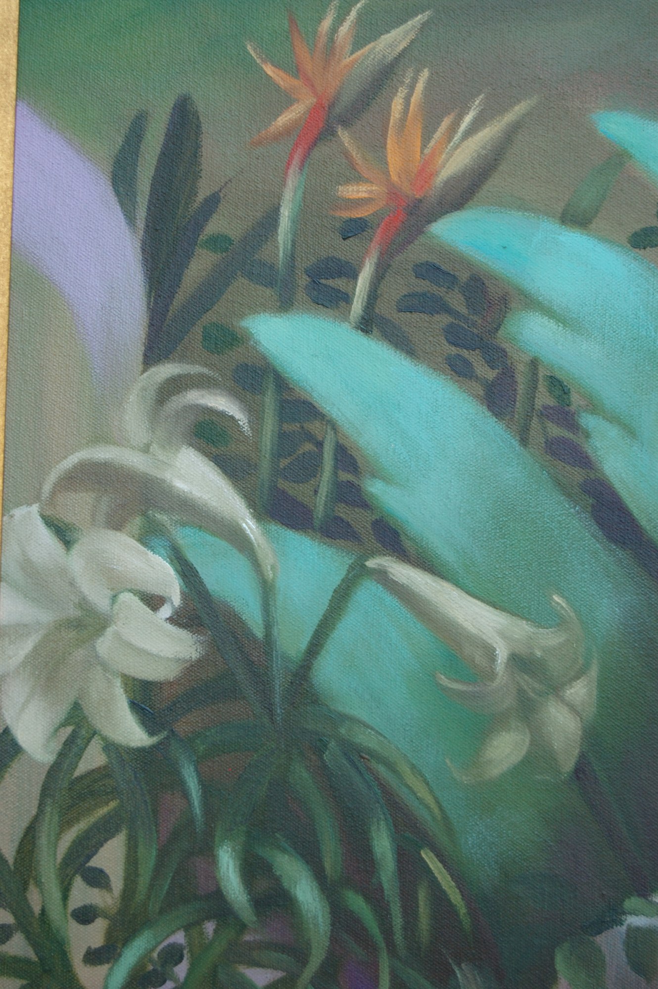 The painting is a depiction of the first mention in the Bible of the resurrection, which Jesus would teach during His life, although no one really grasped what He was saying. The figures are reading the Scripture themselves, as if to discover why they're awake again. The flowers are Bird of Paradise and Easter Lilies in full bloom. The two dancing, rejoicing figures in the back are carrying sheaves of wheat, often used as symbols to describe the Lord's gathering of His people.