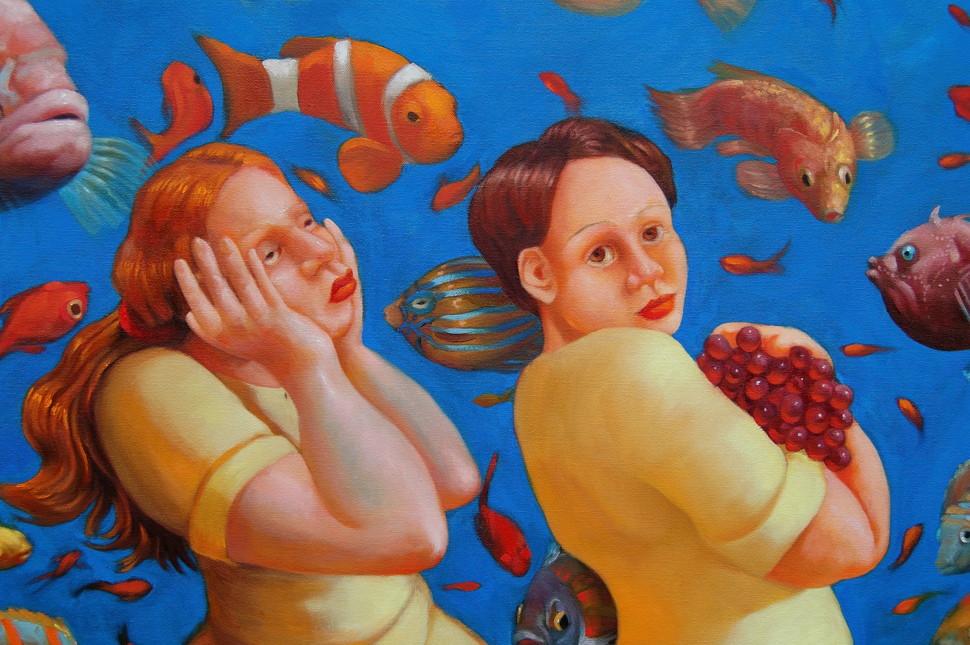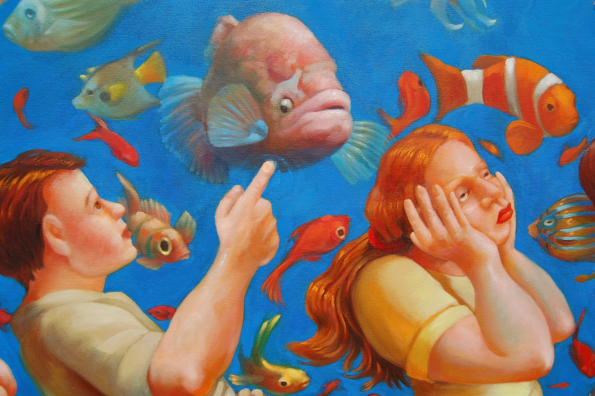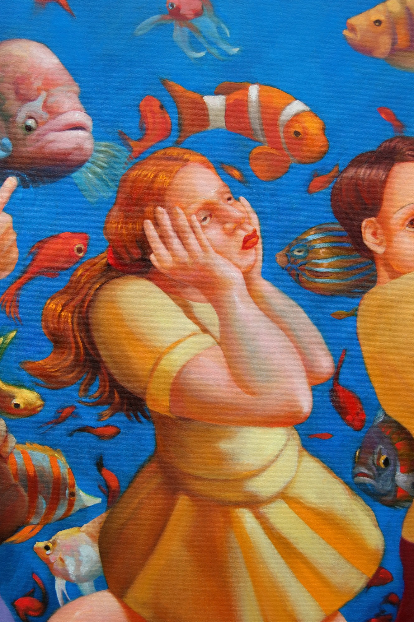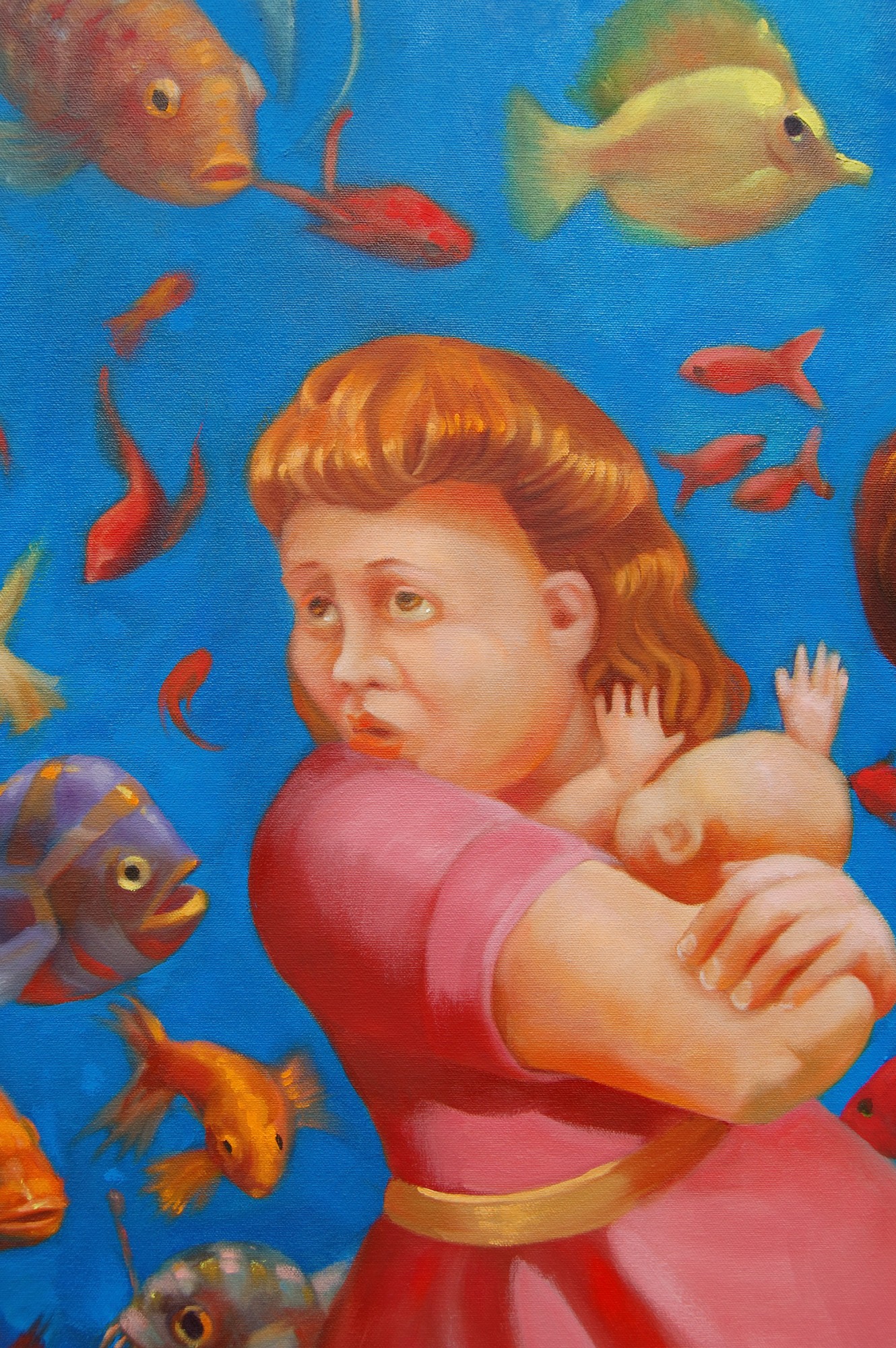 The 4 people are passing the standing waters on dry ground with various types of fish swimming in the wall of water behind them. The chains of their slavery lie on the ground to the left. The figure furthest to the left looks back at the Egyptians who are in pursuit. The second figure delights at the fish staring at him and pokes his finger into the standing wall of water. The third figure, representing doubt, hasn’t quite grasped the idea that the waters of the Red Sea have parted for her to cross, yet she's not drowning. The figure furthest to the right represents people of faith and courage as she dances with the fruit of the Promised Land in her arms, the promise awaiting after the Red Sea is crossed by the entire nation.