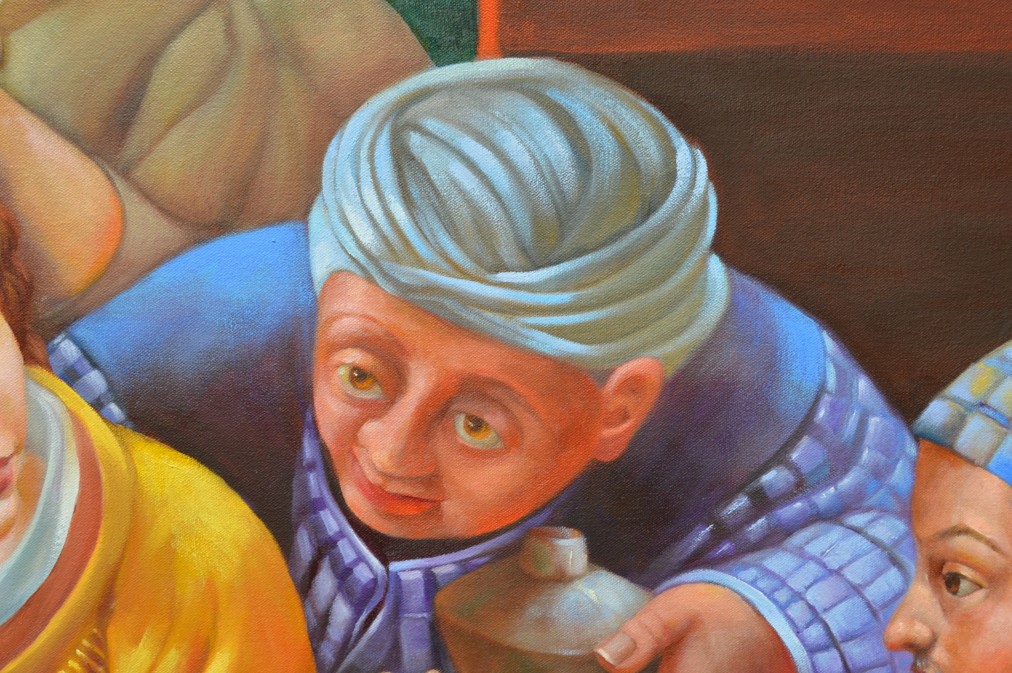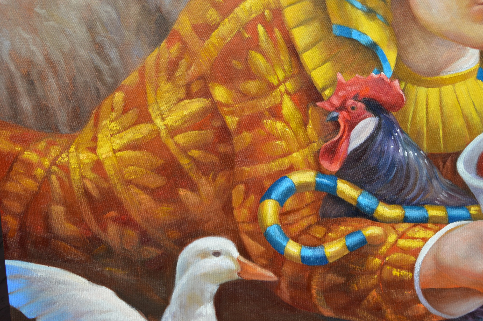This painting depicts what is referred to as The Epiphany, the time when kings from the east came to find the newborn King, Jesus, which is traditionally celebrated on the 6th of January. Mary holds the Child on her lap as He curiously inspects the fruits in the bowl of an Egyptian king, who holds a rooster and a type of staff used by the kings of the time to signify the dawning of a new era, and the authority of their new rule.