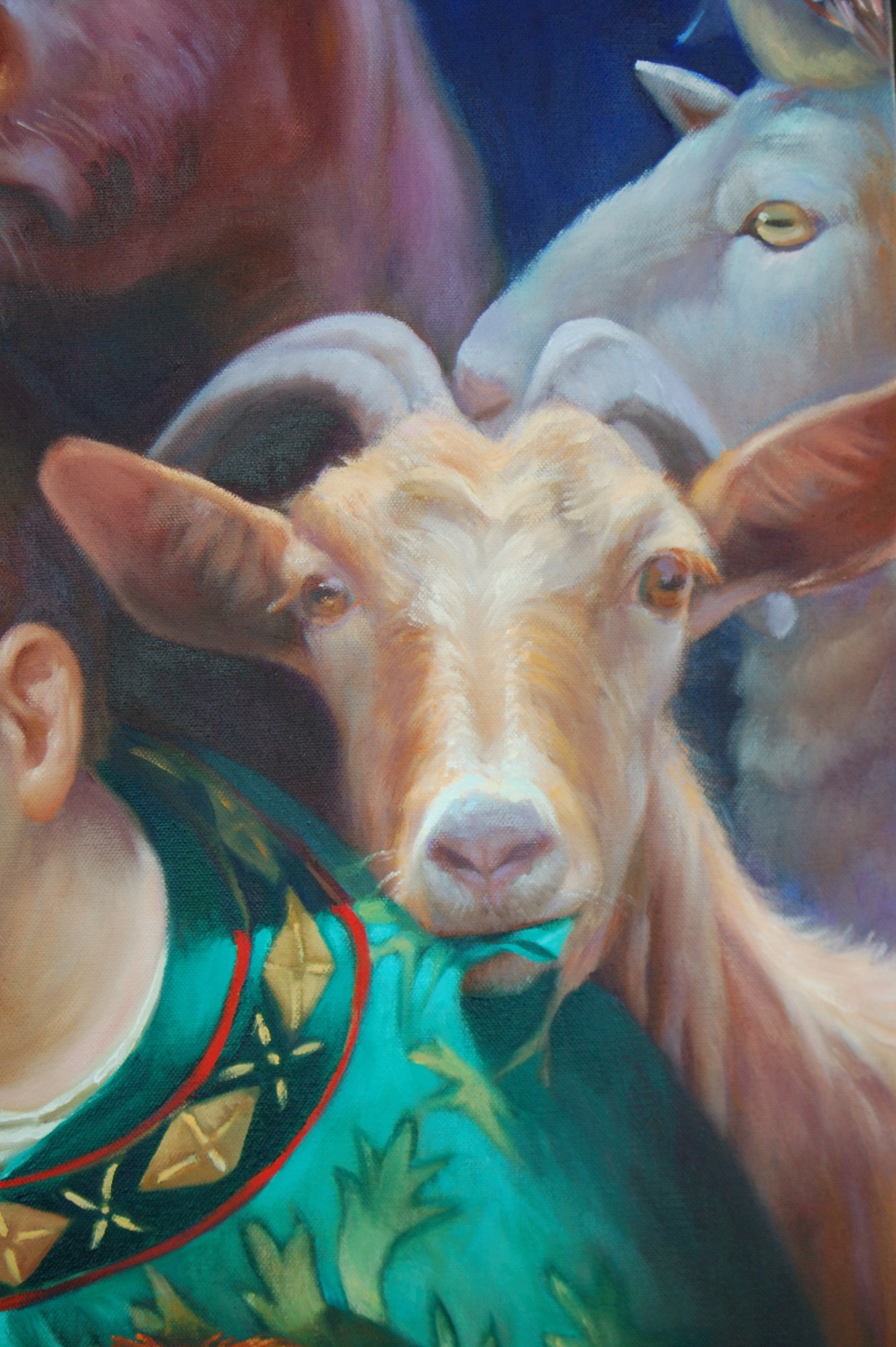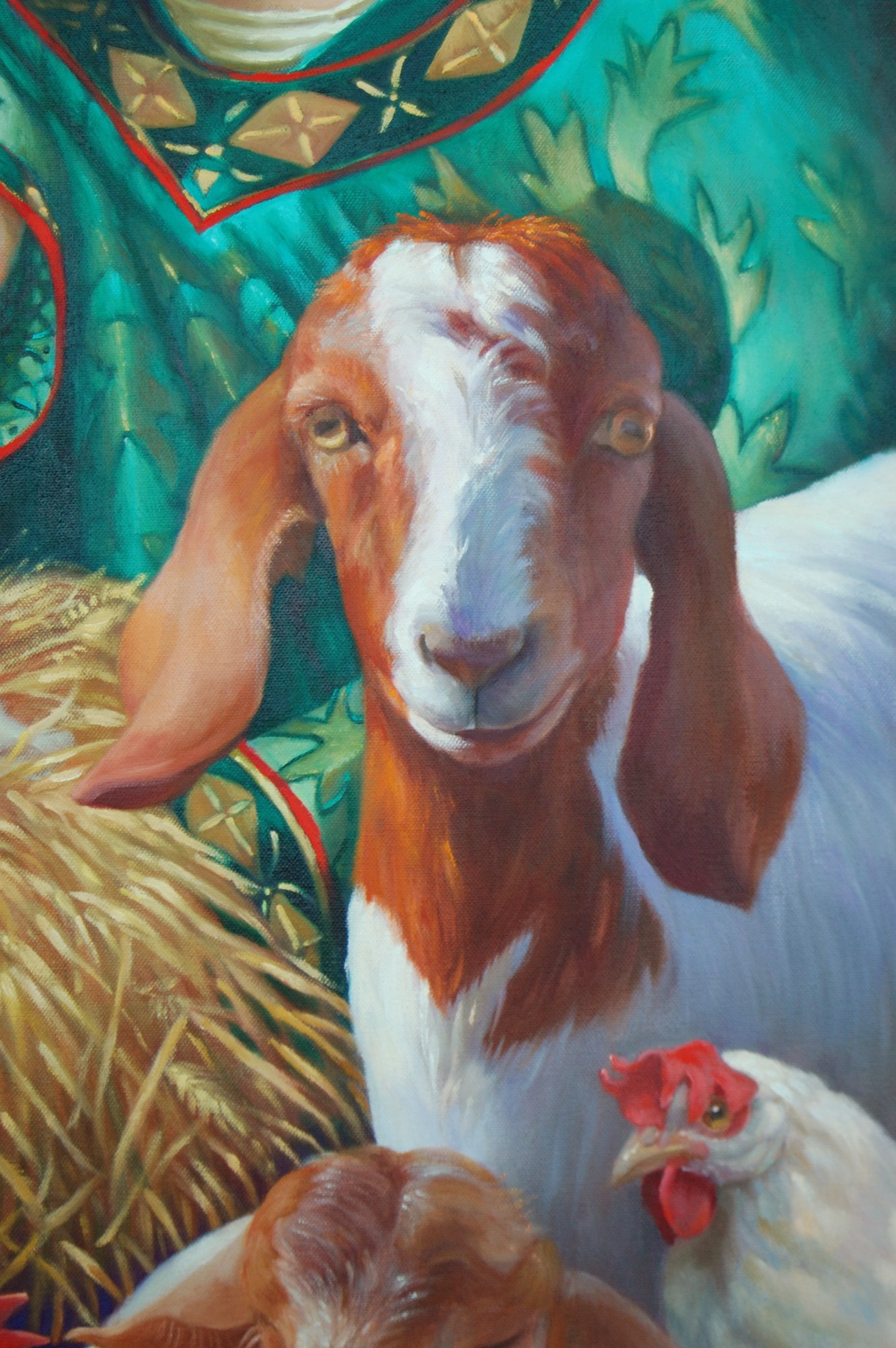 In this depiction of the birth of Jesus Christ we see the Holy Family surrounded by animals one might find in a barn. The infant Jesus touches the extended finger of Joseph reminiscent of God extending His finger to Adam in the Sistine Chapel depiction of the Creation. The donkey is depicted as a symbol of Jesus one day entering Jerusalem on a foal of a donkey. The white horse is a depiction of His eventual return as it is described in the Book of Revelation. Joseph and Mary are painted in royal robes as the parents of a King, though in reality they were extremely poor. Jesus, who was born into poverty, was another illustration of the Apostle Paul’s writing: