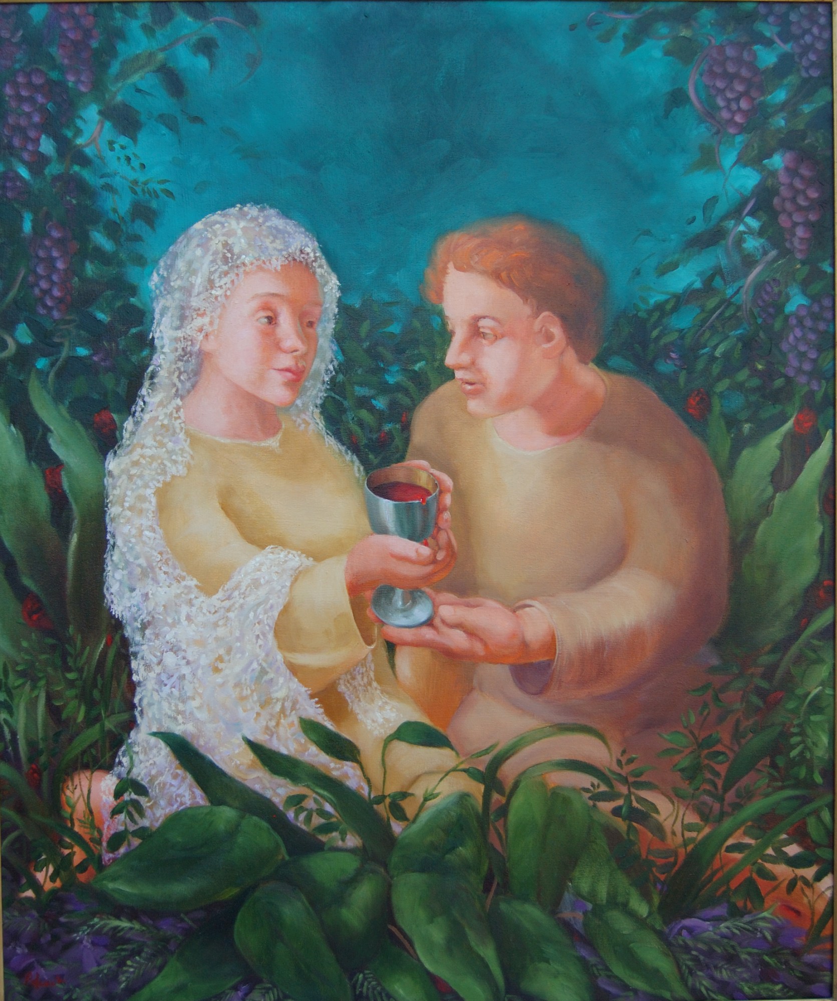 The wine is seen spilling from the cup, a symbol of the Groom's sacrifice, and a wound is seen in the foot of the groom, a symbol of Christ’s manner of death.