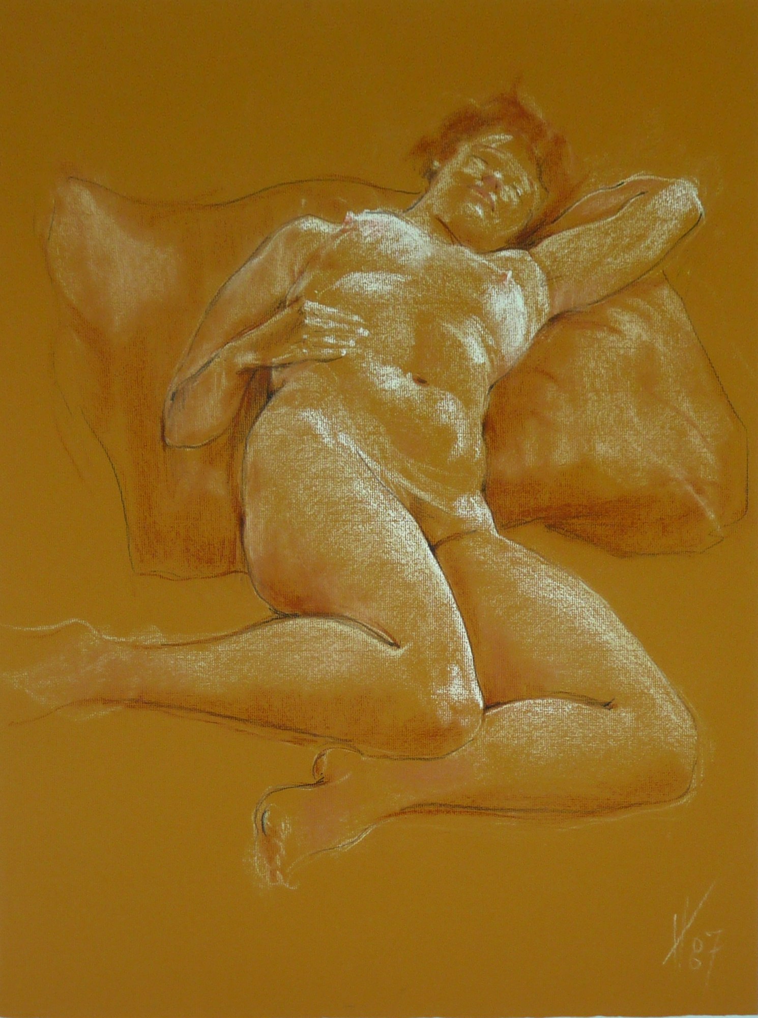 Image of a nude female figure reclining on a large pillow on the floor with her legs bent