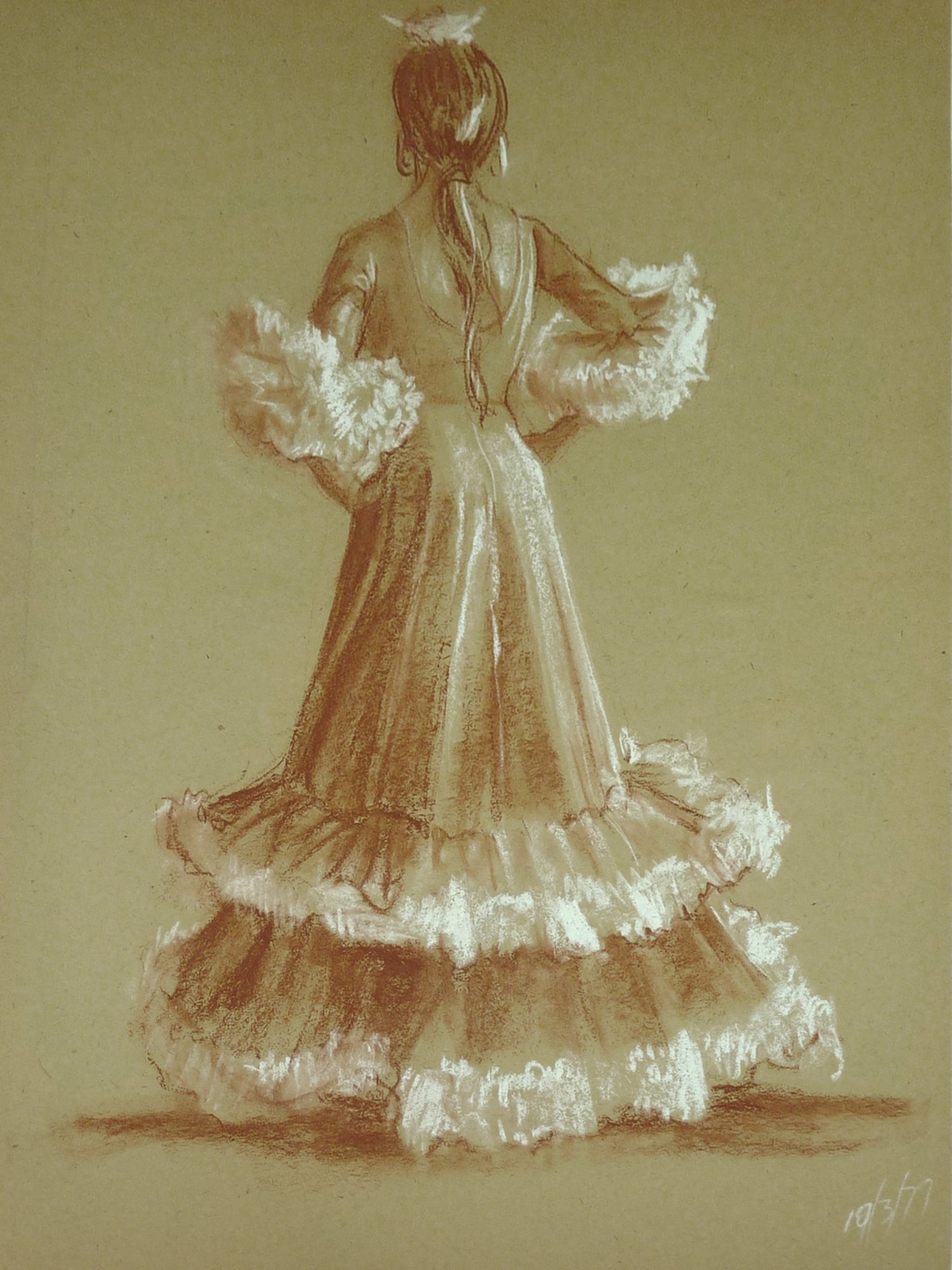 Back view of a standing woman wearing a frilly dress