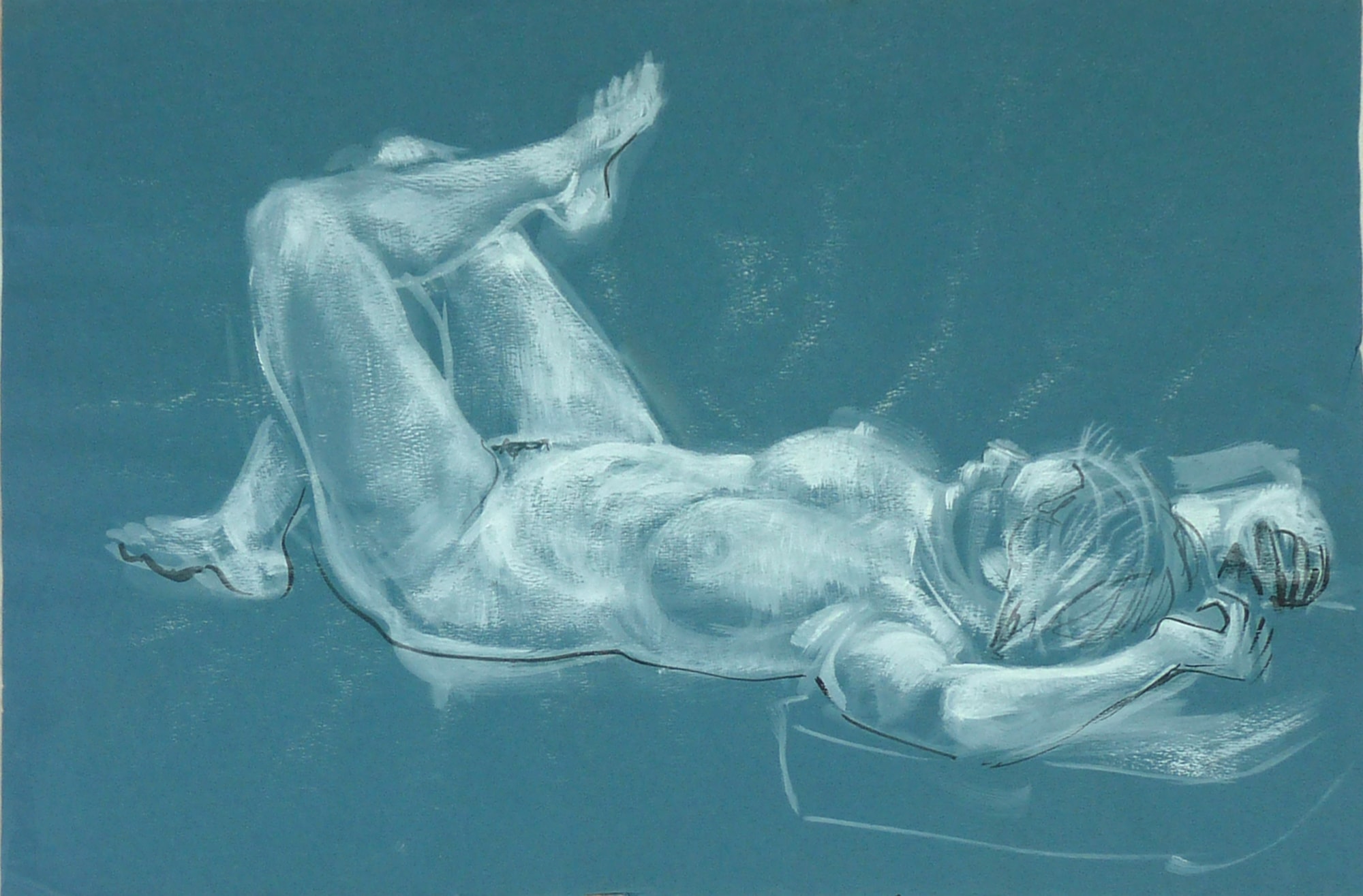 Image of a nude female figure lying on her back with her legs bent up and one leg crossed over the other. Her hands are up over her head