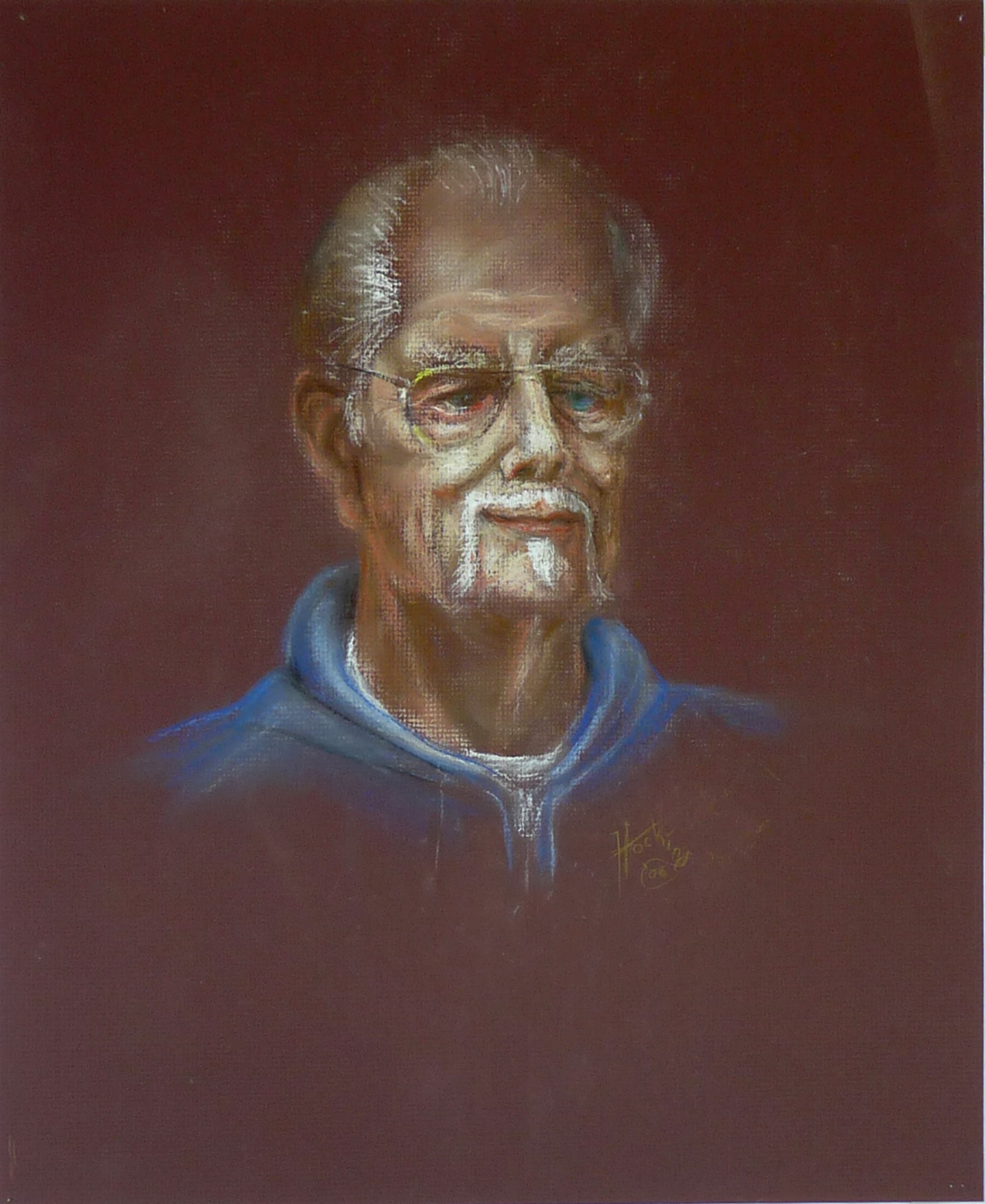 Self-portrait. Image of the artist wearing glasses and a blue sweatshirt