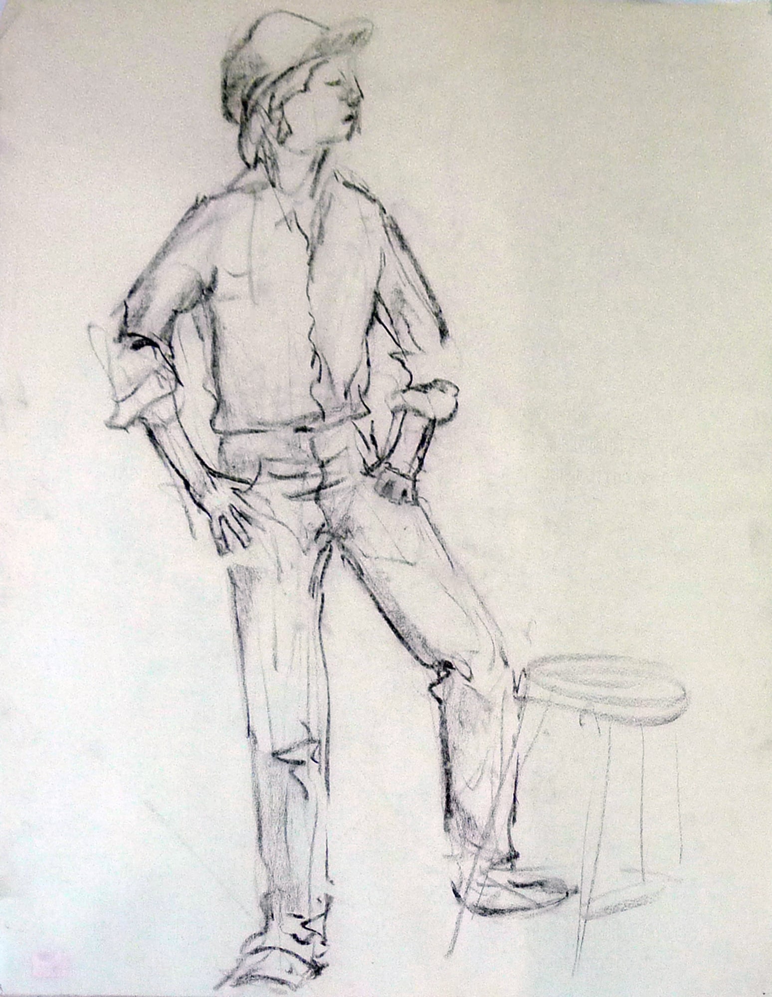 Image of a clothed, human figure wearing a hat, long-sleeved shirt with sleeves rolled up. They are standing with their hands on their hips and one foot resting on the lower rung of a stool
