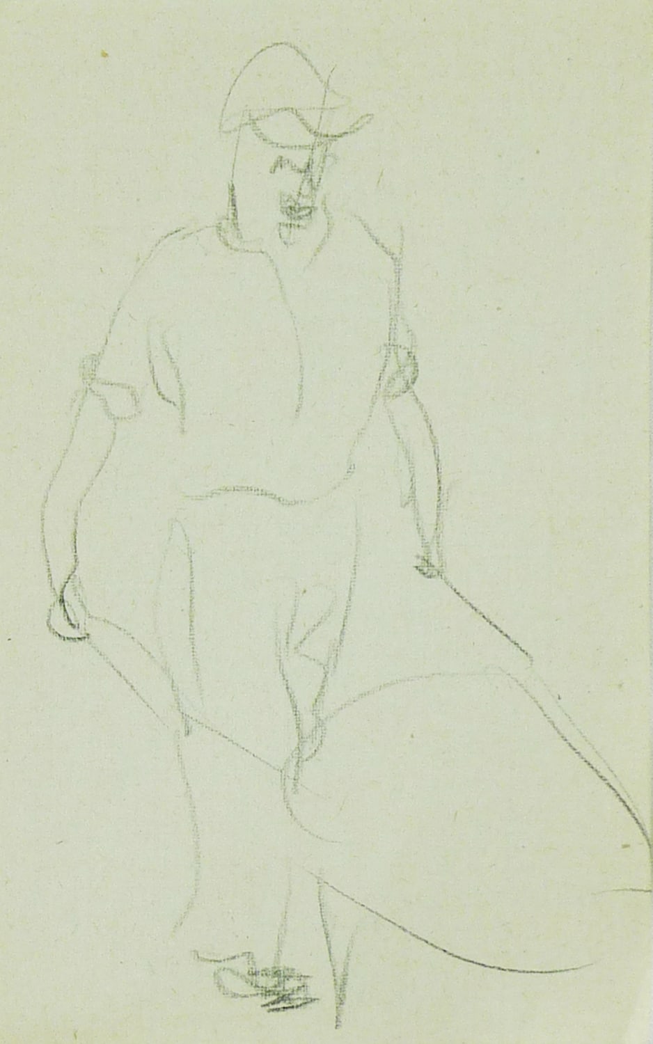 The front side shows a man wearing a cap, pushing a wheelbarrow. The backside is a front view of a woman