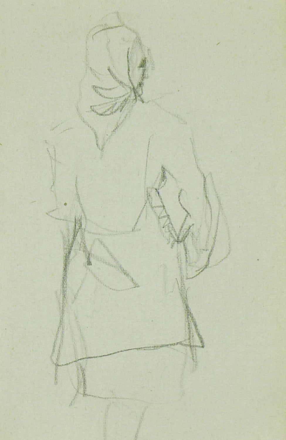 The front side is the back view of a woman wearing a scarf. The backside shows a man wearing a coat and hat
