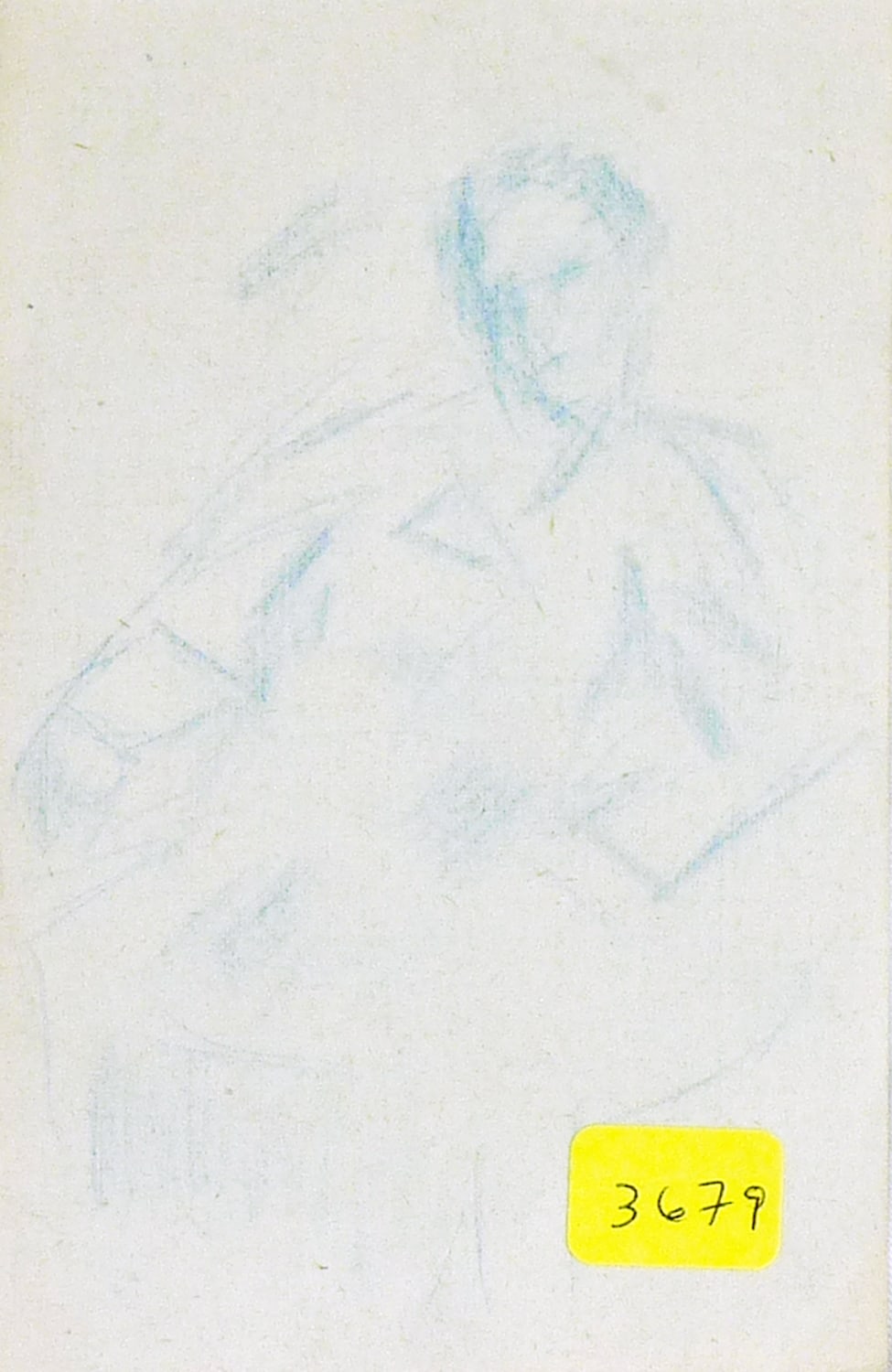 The front side is a front/side view of a woman seated in an armchair. The backside is a faint image of a man seated in a chair