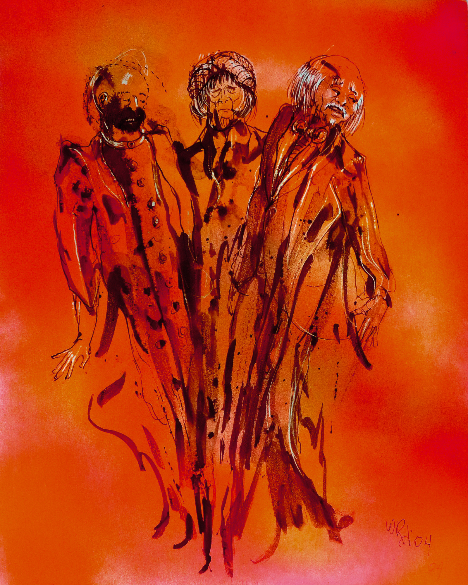 Image of three male figures standing together against a bright, orange and red background. One figure is bearded, one is balding, and one is wearing a hat.