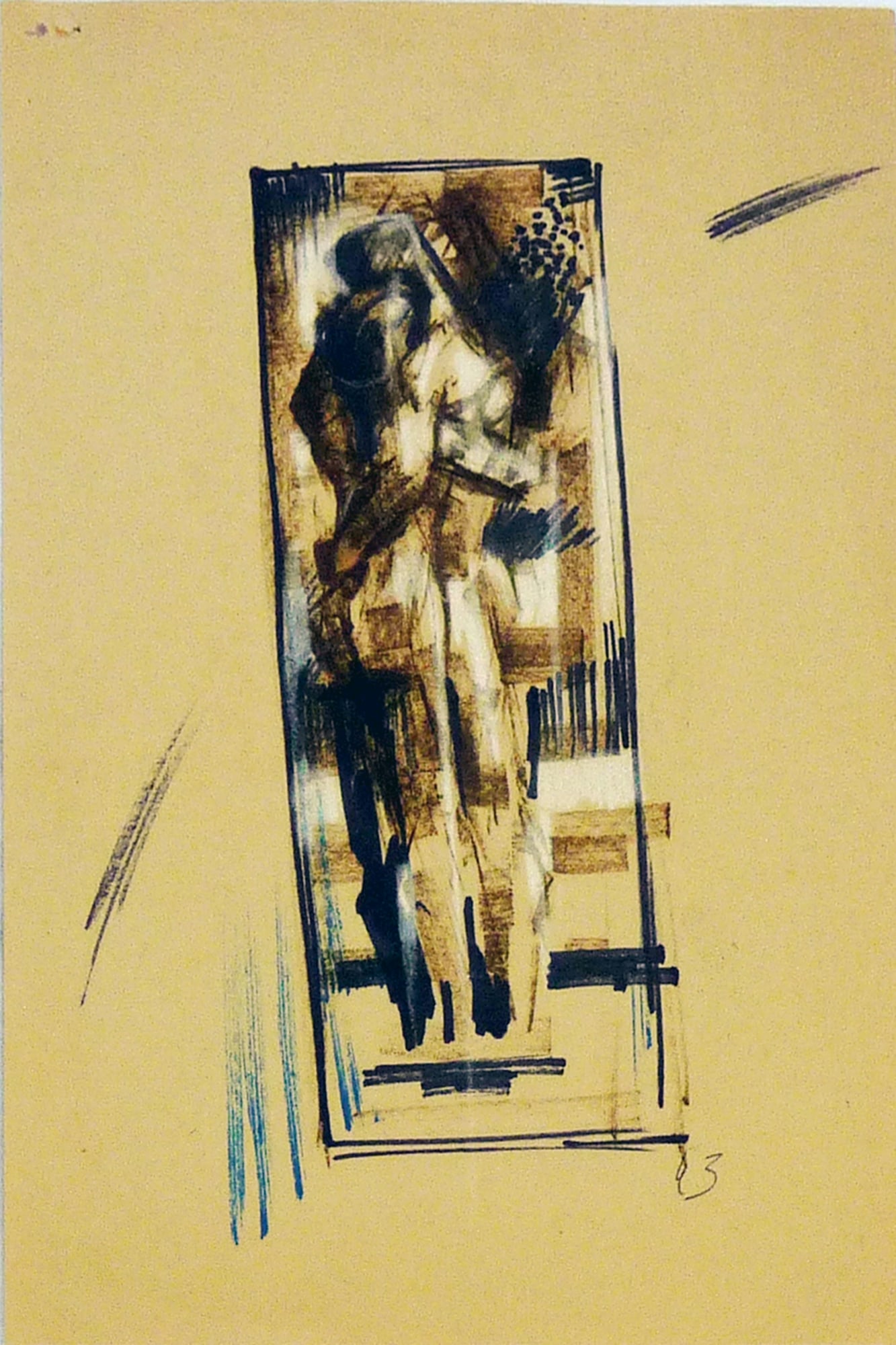 Rectangle containing an image of a nude male and female figure standing in an embrace