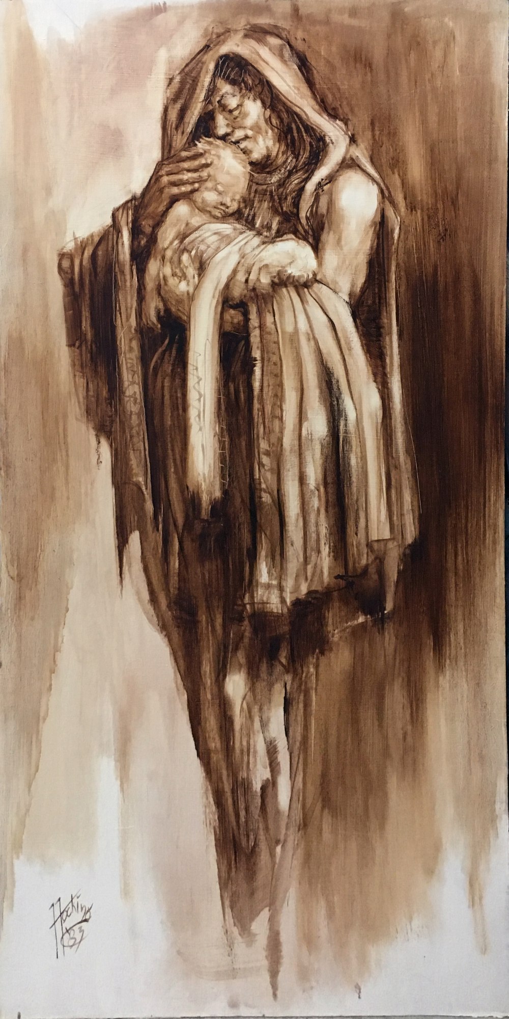Image of a standing female figure dressed in a hooded robe, holding a baby in her arms