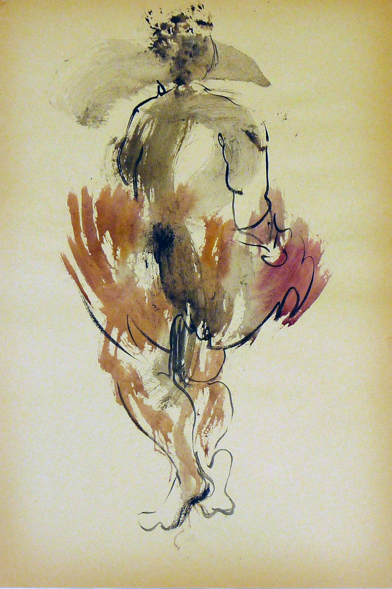 Abstract image of a standing, human figure expressed in orange and brown strokes