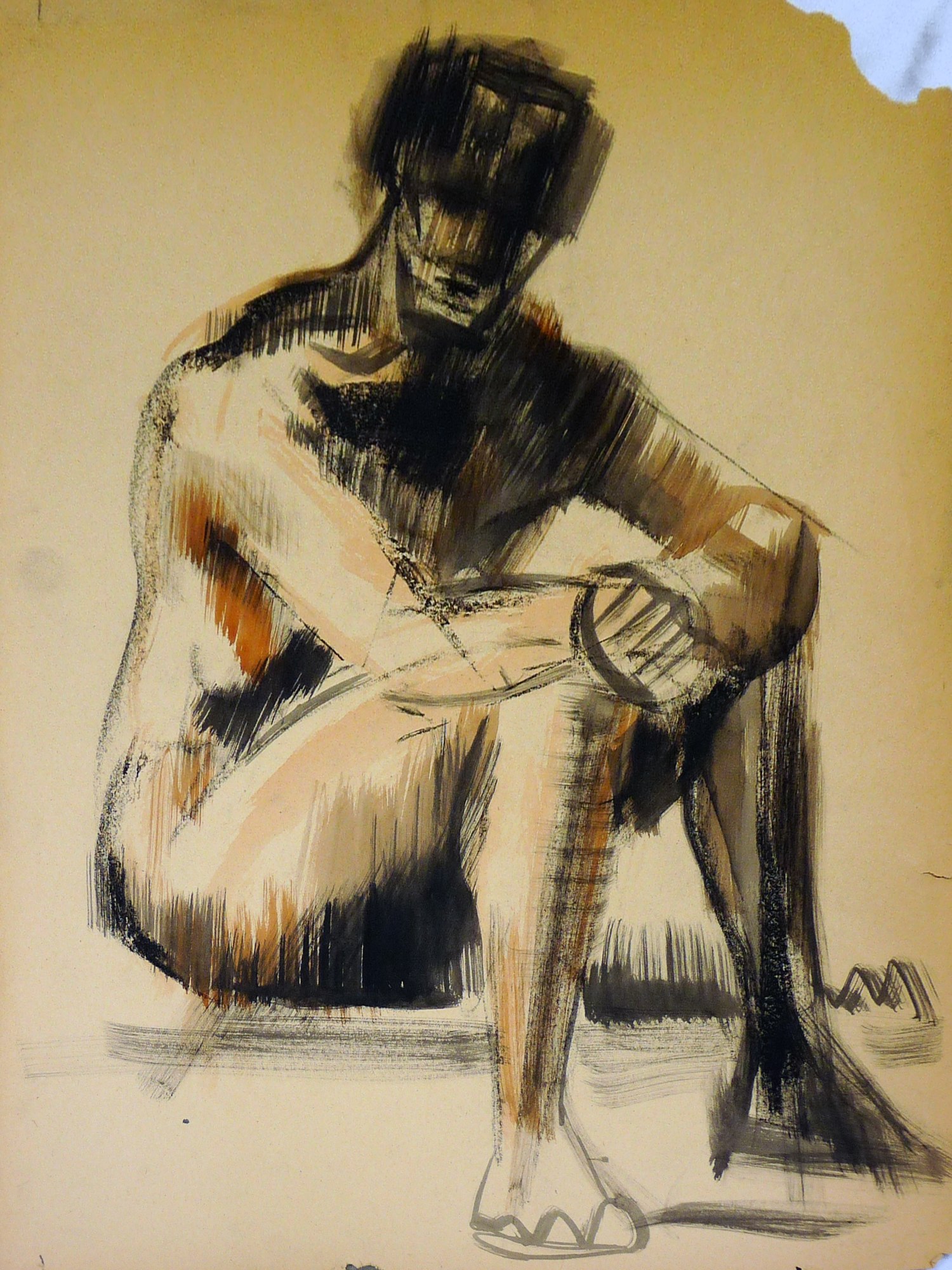 Image of a young man seated with his arms on his knees expressed in orange and black strokes