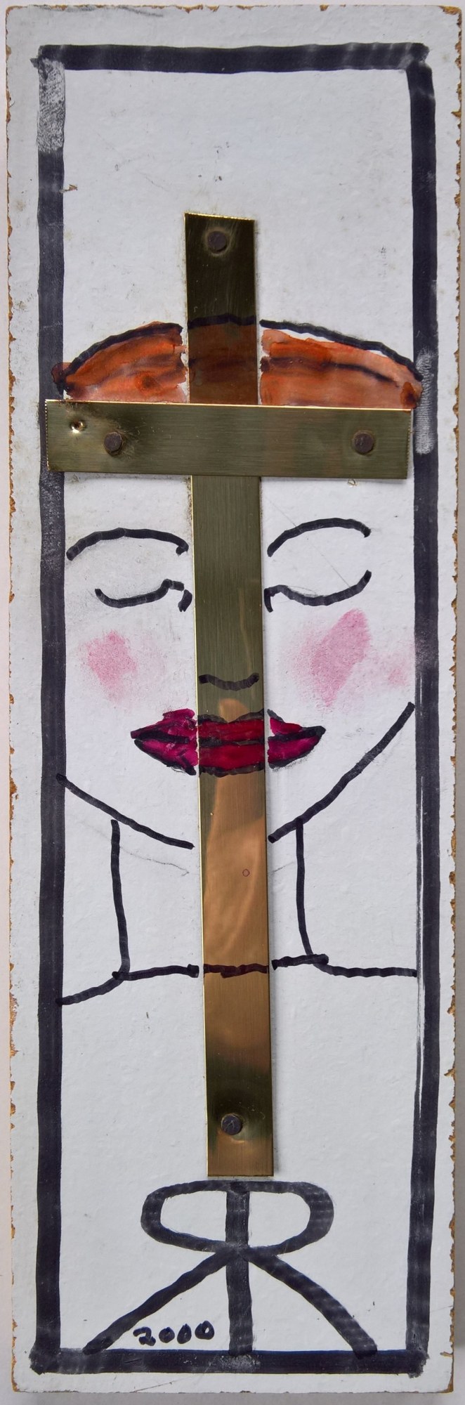 "Joan of Arc" -- Magic markers and trophy materials on particle board - approx. 12 x 3 in. - 2000