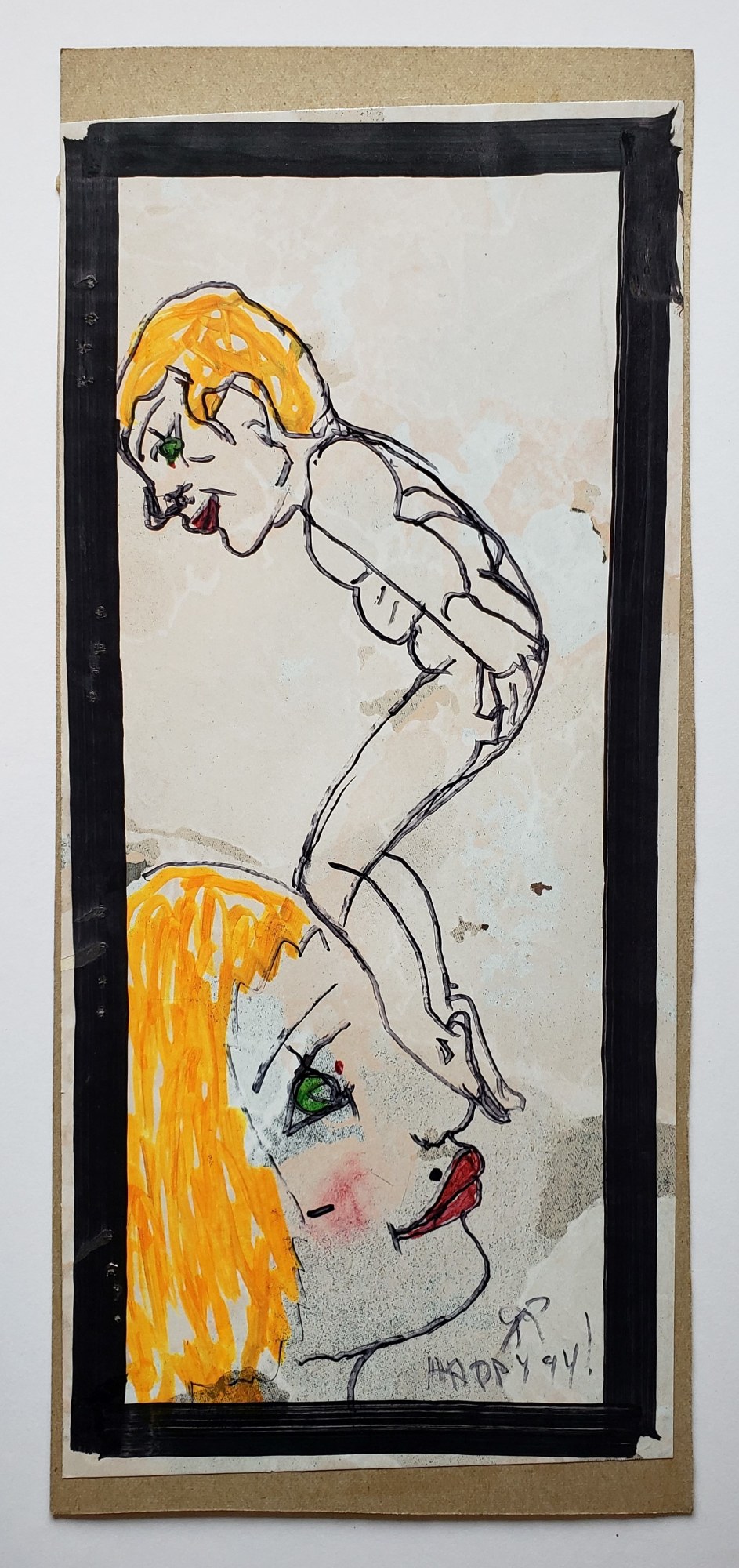Woman with Man -- Magic markers on wallpaper sample mounted on cardboard stock - 16 x 7 in. - 1994