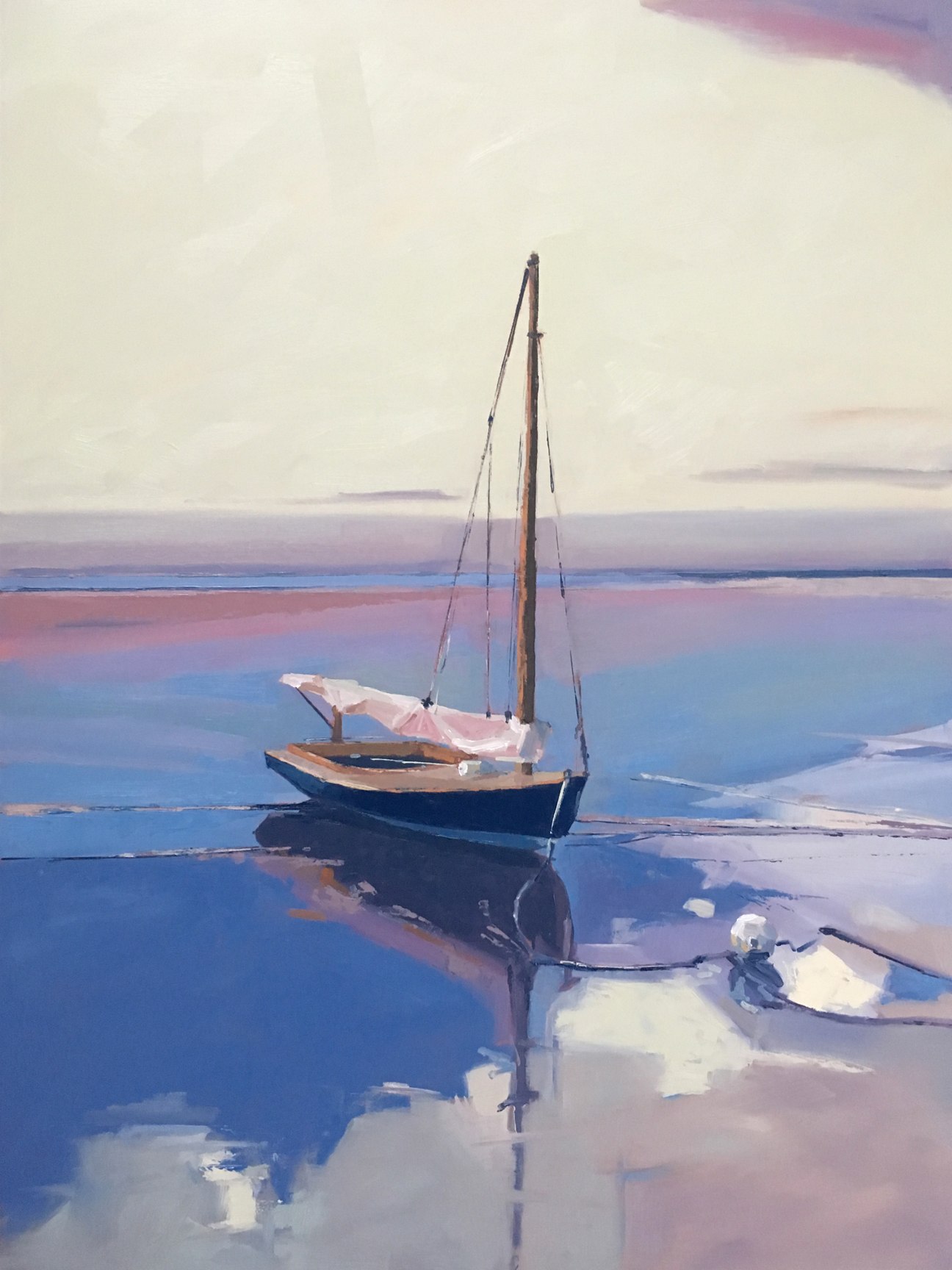 Small boat on incoming tide at sun set.